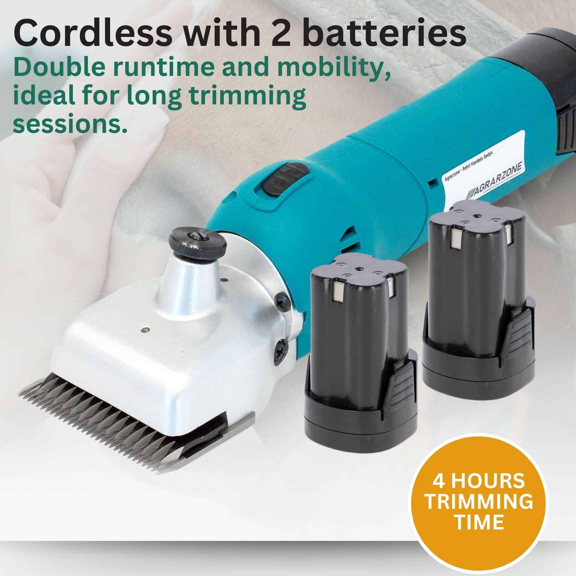 Mit der neuen Agrarzone Schermaschine PowerCut Akku können Sie Ihr Pferd ohne nerviges Stromkabel präzise und schnell scheren. Die Schermaschine überzeugt durch ihr sehr gutes Preis-/ Leistungsverhältnis und den zwei 14,4 Volt Lithium-Ionen Blockbatterien. Dank den zwei 14,4 Volt Lithium Blockbatterien ist ein pausenloses Scheren ohne Netzstrom möglich. Der leistungsstarke 45 Watt Motor leistet mit 2300 Hüben pro Minute eine außerordentlich hohe Durchsetzungskraft und steht den netzbetriebenen Modellen um nichts nach.