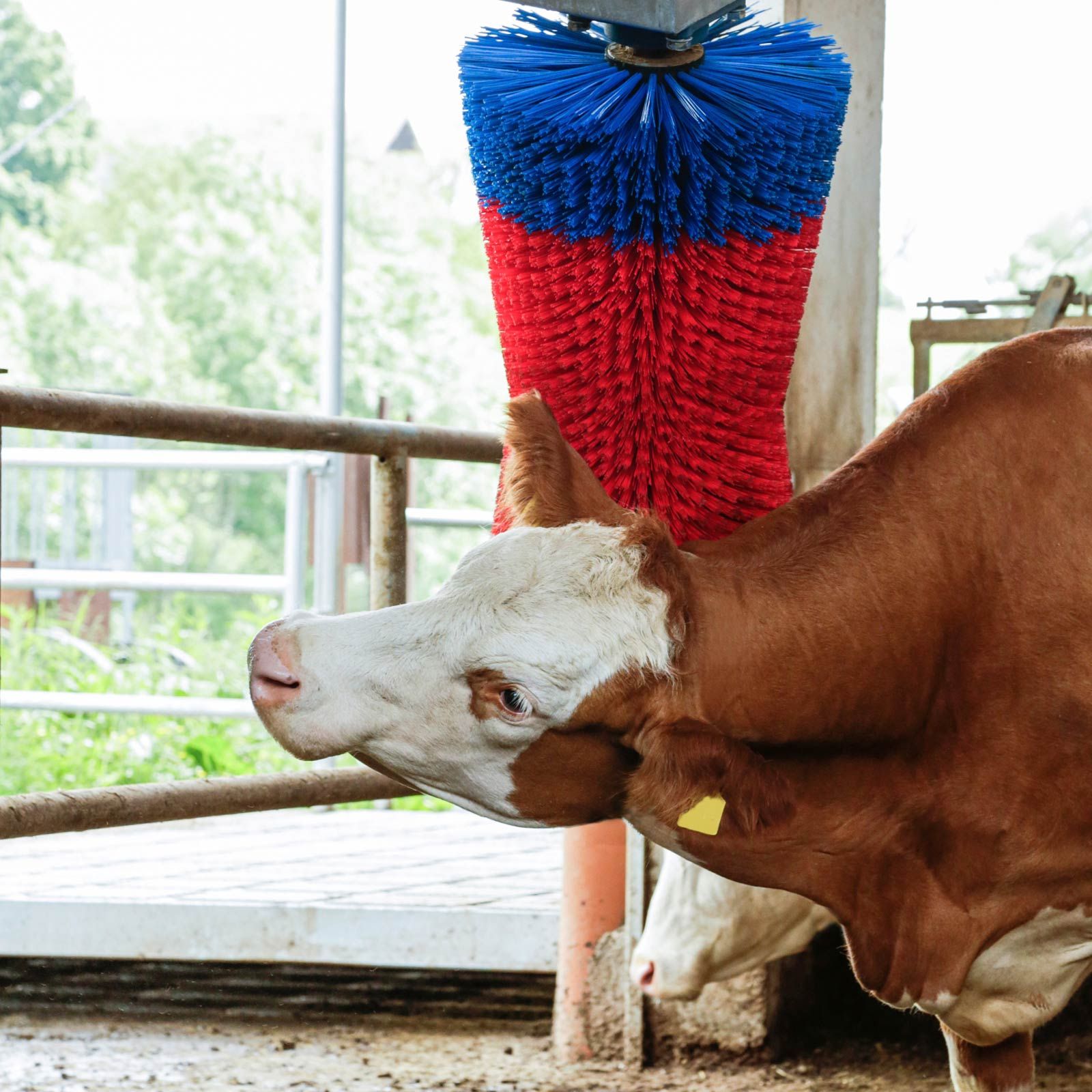 Mit der Kuhbürste MaxiSwing reinigt sich Ihr Vieh gerne, freiwillig und völlig selbstständig. Durch die spezielle Anordnung der Bürste in vertikaler, pendelnder Form wird die Reinigung des Fells von Kopf bis Rumpf erleichtert. Die Kuhbürste ist von allen Seiten zugänglich und kann sich in jede Richtung und beinahe jeden Winkel drehen, so wird quasi jede Körperstelle des Tieres ausgiebig gekratzt und gepflegt. Des Weiteren gibt es auch das Problem des Aufspringens, wie bei horizontalen Bürsten, nicht!