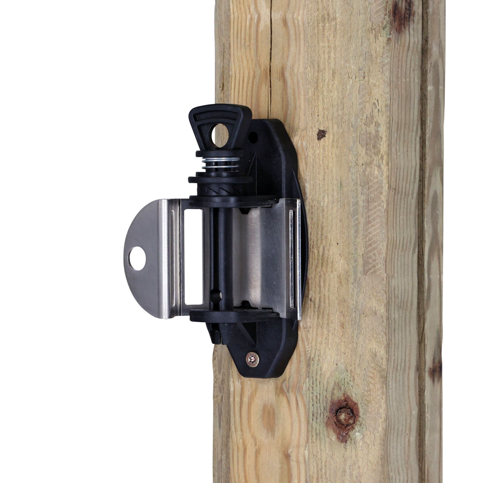 Der flexibel einsetzbare Premium Isolator TITAN mit Anschlussplatte aus Edelstahl eignet sich zum Einhängen von Torgriffen bei gleichzeitigem Spannen des Leitermaterials. Der Bandisolator ist als Anfangs- oder Endisolator für Tore ideal, denn der Torgriff wird direkt elektrisch kontaktiert. Gleichzeitig kann Weidezaunband bis 40 mm Breite sehr leicht und sicher von Hand durch eine integrierte Einrastfunktion geführt und nachgespannt werden. Die Montage am Holzpfahl ist durch Anschrauben einfach und schnell erledigt. Das robuste Material aus glasfaserverstärktem Polyamid ist zusätzlich sehr wetterbeständig und überzeugt durch eine lange Haltbarkeit.