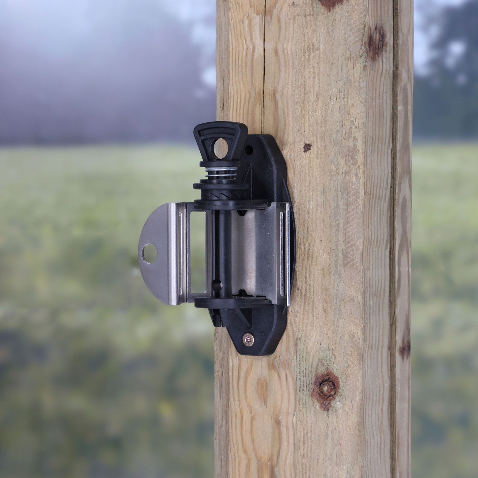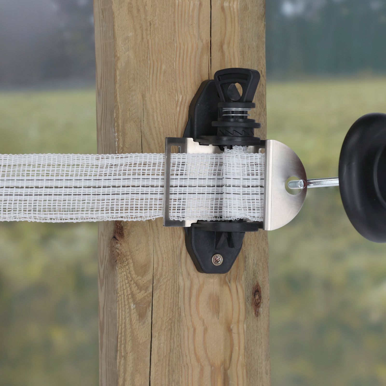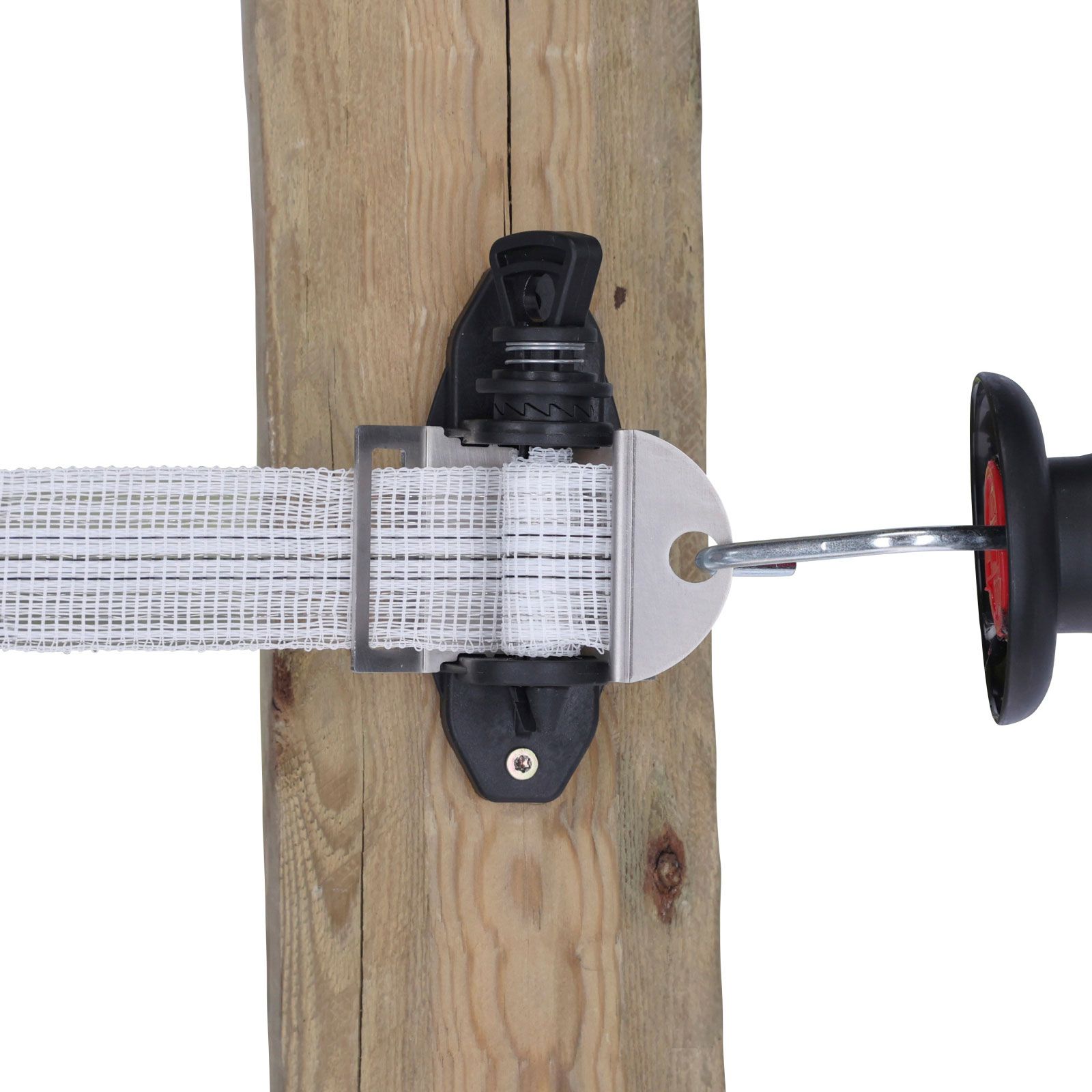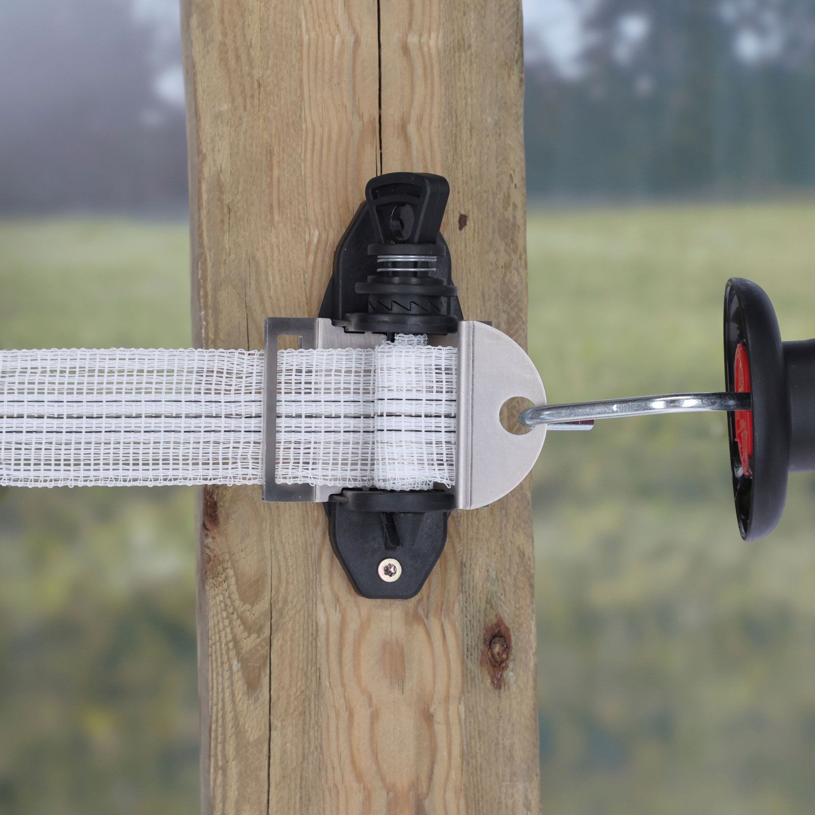 Der perfekte Anfang- / Endisolator für das Einhängen von Torgriffen und gleichzeitige Spannen von Weidezaunbändern bis 40 mm Breite.