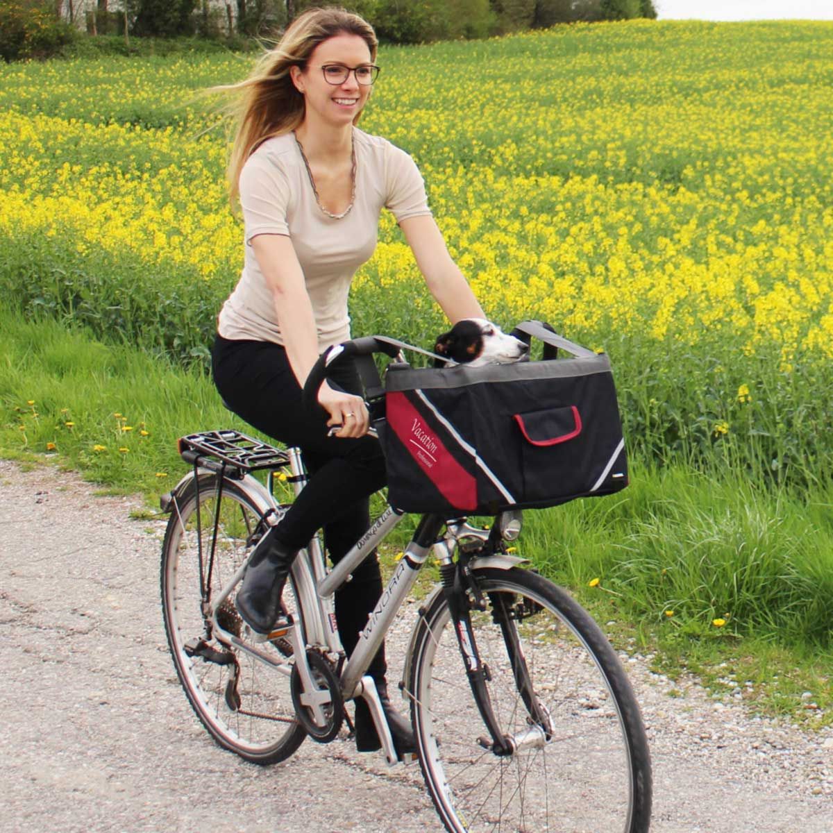 Diese praktische Fahrradtasche ist für Hunde und Katzen geeignet.