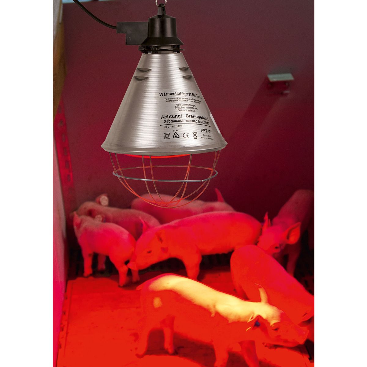 Geben Sie jungen Tieren ausreichend Nestwärme mit dieser Infrarotlampe! Neugeborene oder kranke Tiere im Stall? Mit dieser Wärmelampe können Sie Ihre Klein- und Nutztiere unterstützen und eine kuschelige Nestwärme erzeugen. Die Infrarotlampe fördert das Wachstum und die Genesung. Das Infrarot-Wärmestrahlgerät mit 150 Watt ist mit oder ohne Sparschalter erhältlich. Der Aluschirm hat einen Durchmesser von 21 cm und ist mit 6 Lüftungsschlitzen ausgestattet, um eine bessere Luftzirkulation zu gewährleisten. Durch die dauernde Zirkulation besitzt die Lampe auch eine hohe Lebensdauer. Die Infrarot Glühbirne ist durch ein Gitter geschützt und eine Befestigungskette ist im Lieferumfang enthalten.