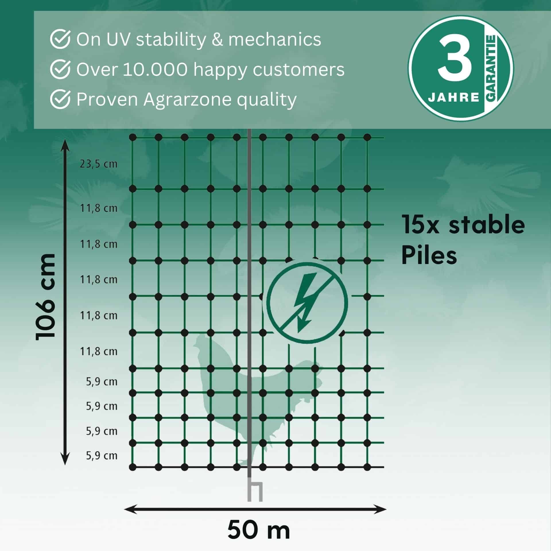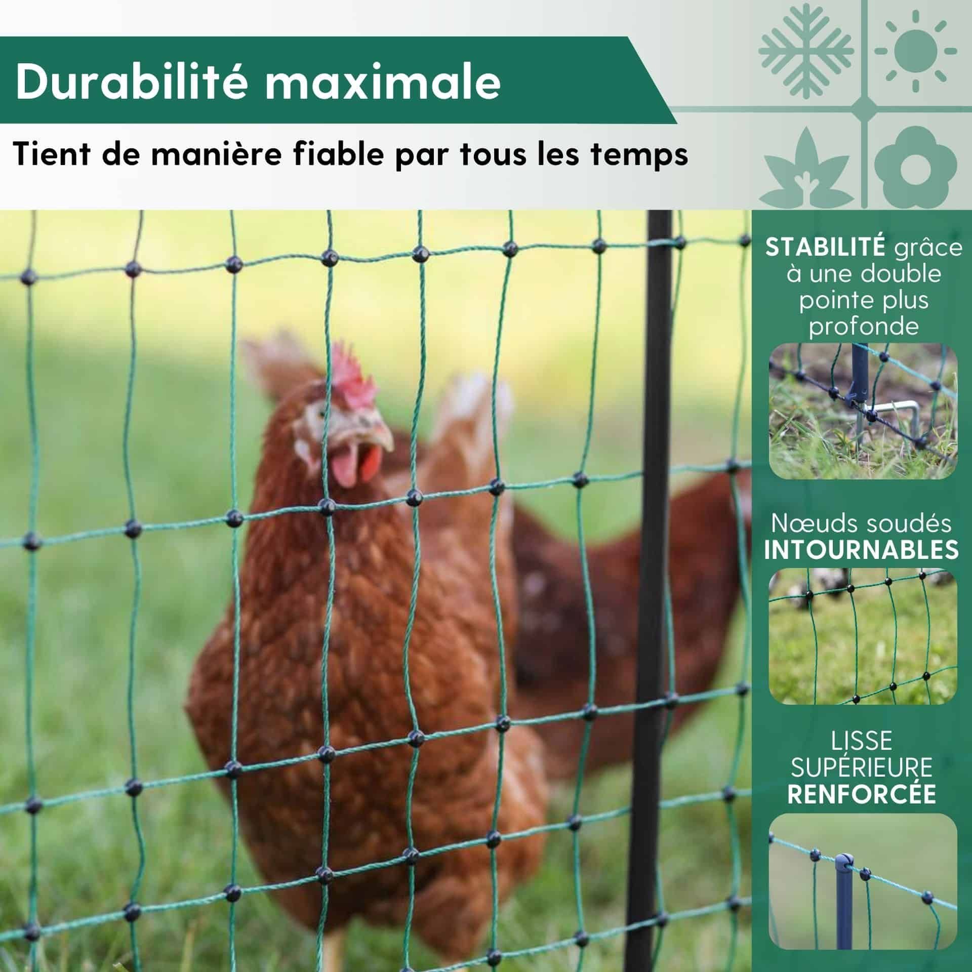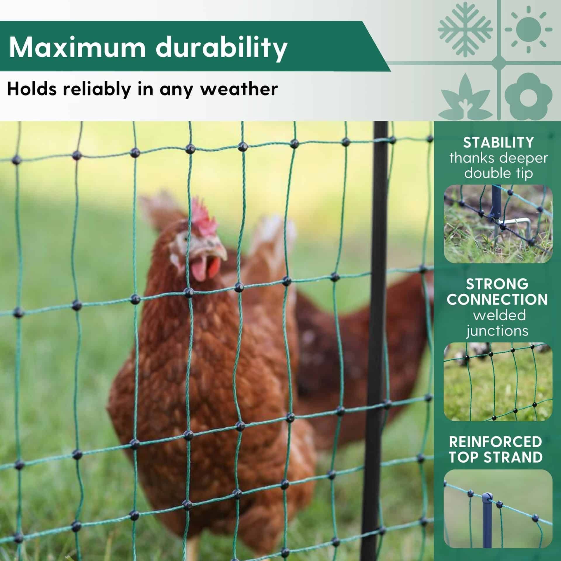 Die stabilen Kunststoffpfähle mit Doppelspitze sorgen für einen guten Stand in erdigen oder sandigen Böden. Für die guten Hüteeigenschaften sorgt zusätzlich eine Kunststoffplombe an jedem Maschenkreuzpunkt, die unlösbar verschweißt ist. Das Geflügelnetz ist mit einer grünen Litze ausgestattet, wodurch er sich besonders harmonisch in die Umgebung einfügt. Für eine zusätzliche Stabilität empfehlen wir einen Holzpfosten in jede Ecke des Netzes zu setzen.