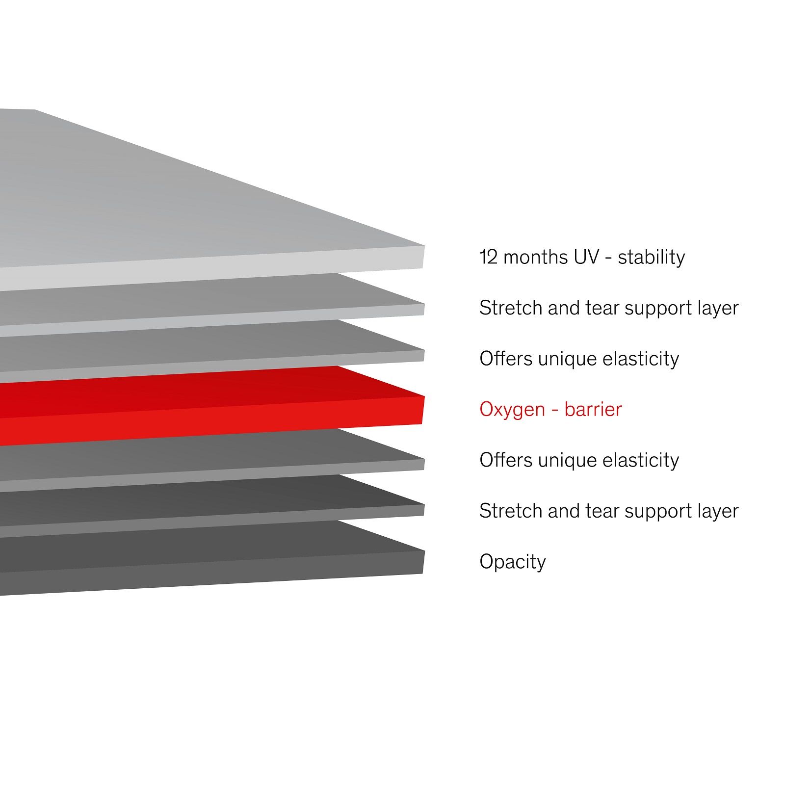 Die Kombination der 7 Lagen mit dem geringen Gewicht vereint die Benefits der klassischen Siloabdeckung mit nur einer Folie. Die ausgezeichnete Sauerstoffbarriere verhindert das Eindringen von Sauerstoff in das Futter. Die Qualität der Silage und deren aerobe Stabilität werden dadurch dauerhaft auf höchstem Niveau gesichert. Der Nährwert hochwertiger Silage bleibt erhalten.