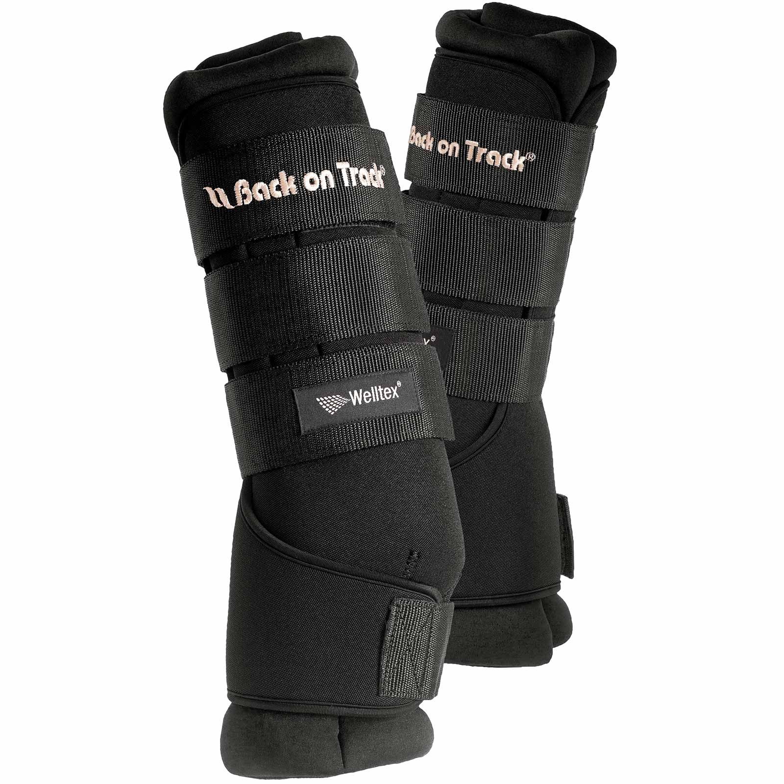 Die Back on Track Stallgamaschen Royal sind mit dem bewährten Welltex Material mit Keramik ausgestattet und fördern aktiv die Blutzirkulation. Die robusten Klettverschlüsse an der Außenhülle ermöglichen ein optimales Anpassen an das Pferdebein, ohne Druck auf der Sehne oder auf geschwollene Beine zu riskieren. Die Form der Gamaschen um das Fesselgelenk ist so konzipiert, dass sie bis zur Hufkrone sitzen. Das dicke Einlagen-Kissen ist von der sehr stabilen Neoprenhülle umgeben. Diese Stallgamaschen sind ausschließlich für Ruhephasen, im Stall und für den Transport, geeignet.