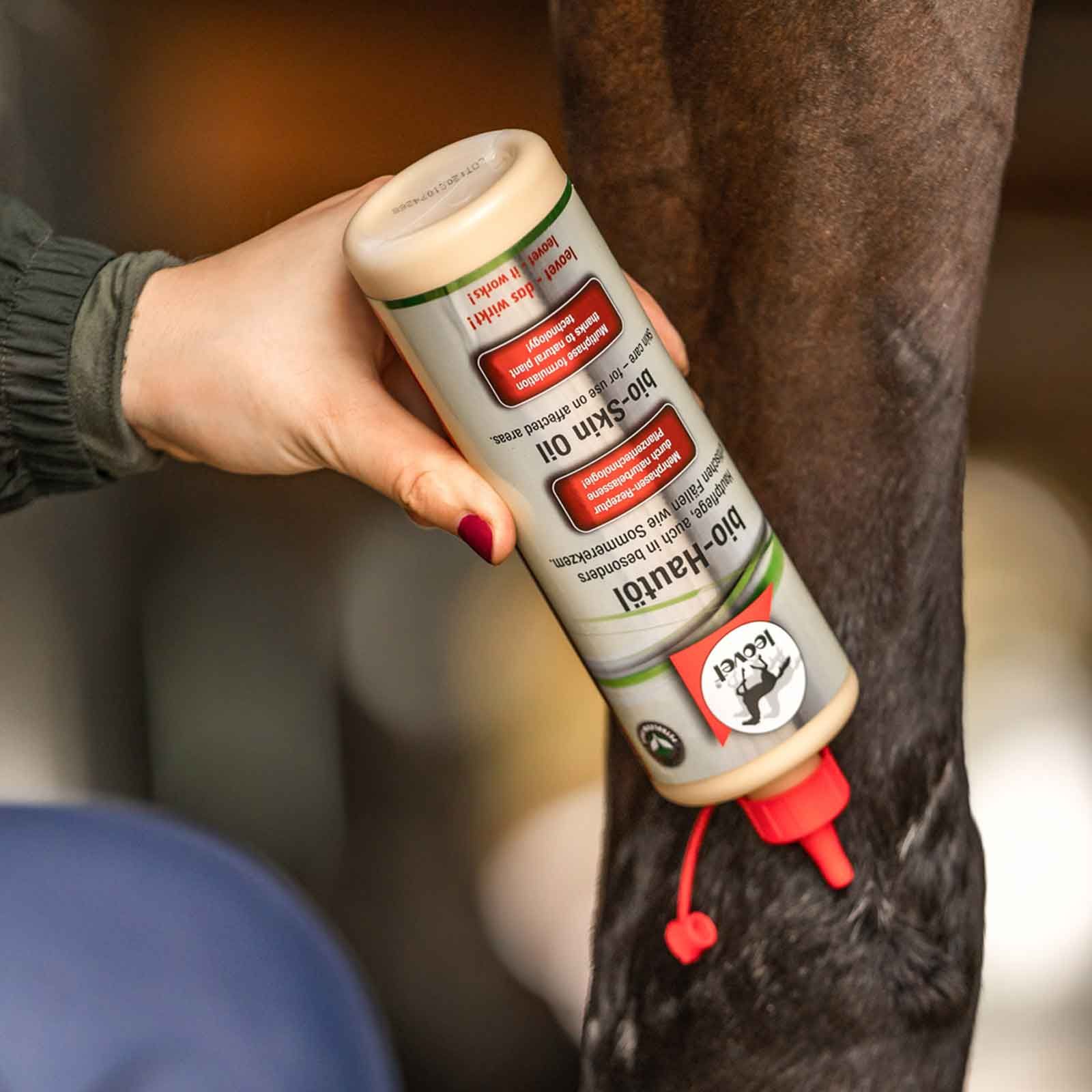 Natürliche Wirkstoffe und eine effektive Mehrphasen Rezeptur machen das Bio Hautöl von Leovet äußerst wirksam. Ringelblumen-, Karotten- und Johanniskrautöl kräftigen rissige und regenerieren angegriffene Hautpartien. Die Durchblutung wird durch das Calendulaöl gefördert und das Haarwachstum an den kahlen Stellen angeregt. Bioschwefelfluid mindert nachhaltig den Juckreiz und die Scheuerneigung, deswegen ist das Leovet Bio-Hautöl ideal für Pferde mit Sommerkzem geeignet. Die Haut kann sich durch die natürlichen Inhaltsstoffe erholen und die natürliche Schutzbarriere wird gestärkt.