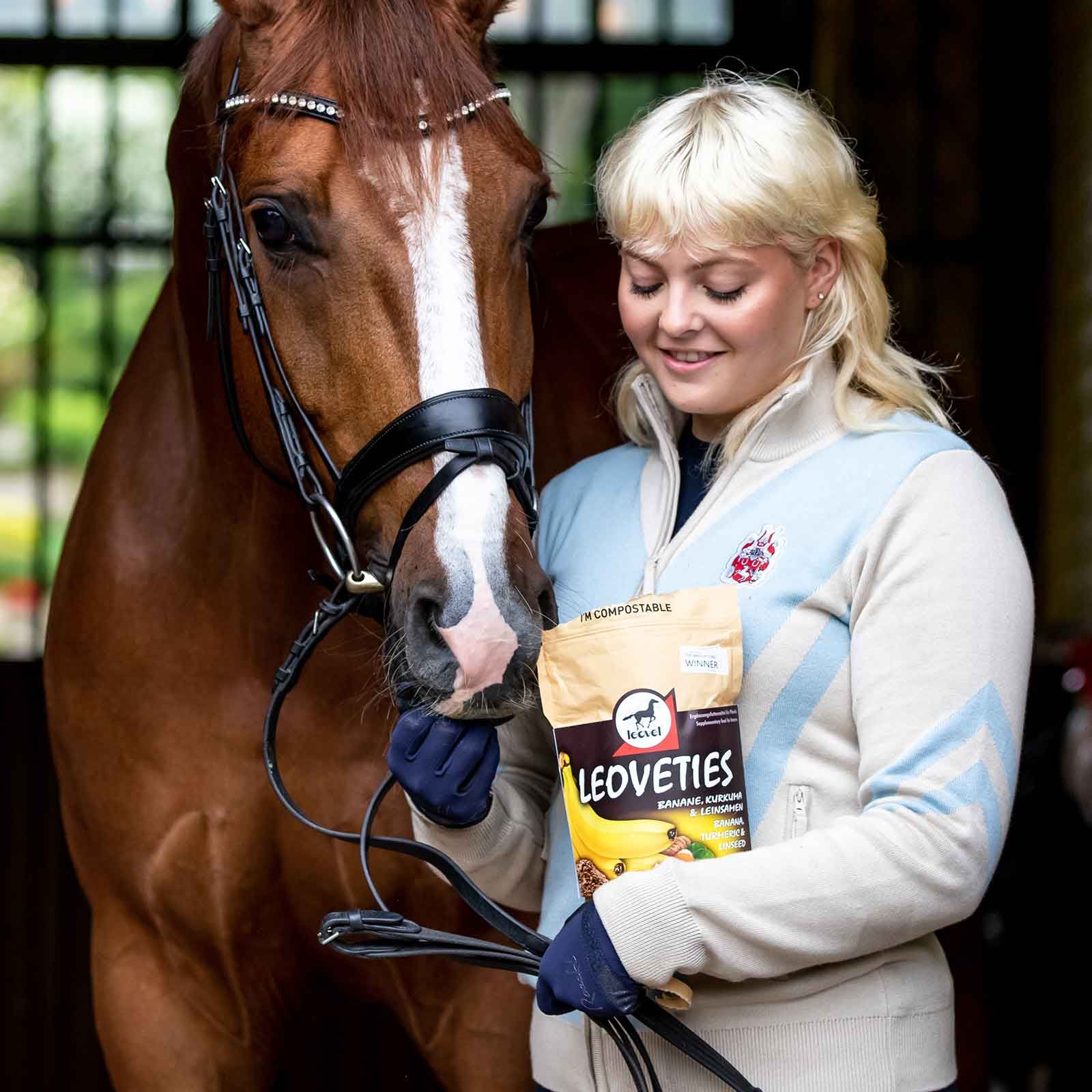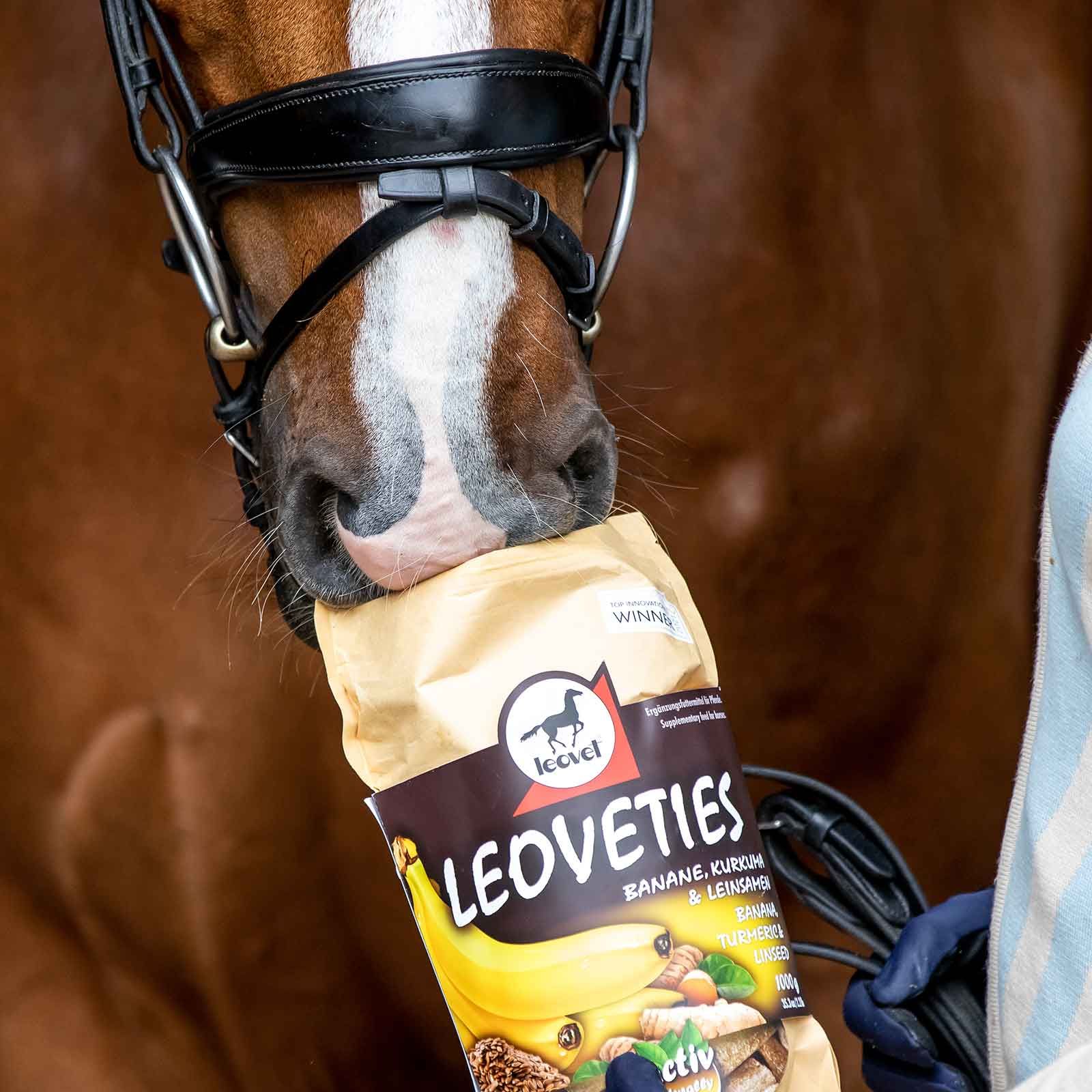 Die Leoveties Leckerlies von Leovet als gesunde Belohnung für Pferde. Bananen liefern gesunde Kohlenhydrate, Ballaststoffe und wertvolle Mineralstoffe wie Magnesium, Kalium und Vitamin B6. Kurkuma gilt als Indiens heilige Pflanze für ein gutes Wohlbefinden. Leinsamen sind reich an Vitaminen, Mineralstoffen und ungesättigten Fettsäuren. Die Zutaten werden bei niedrigen Temperaturen schonend gemischt und daraus entstehen die leckeren Leoveties Pferdeleckerlies.