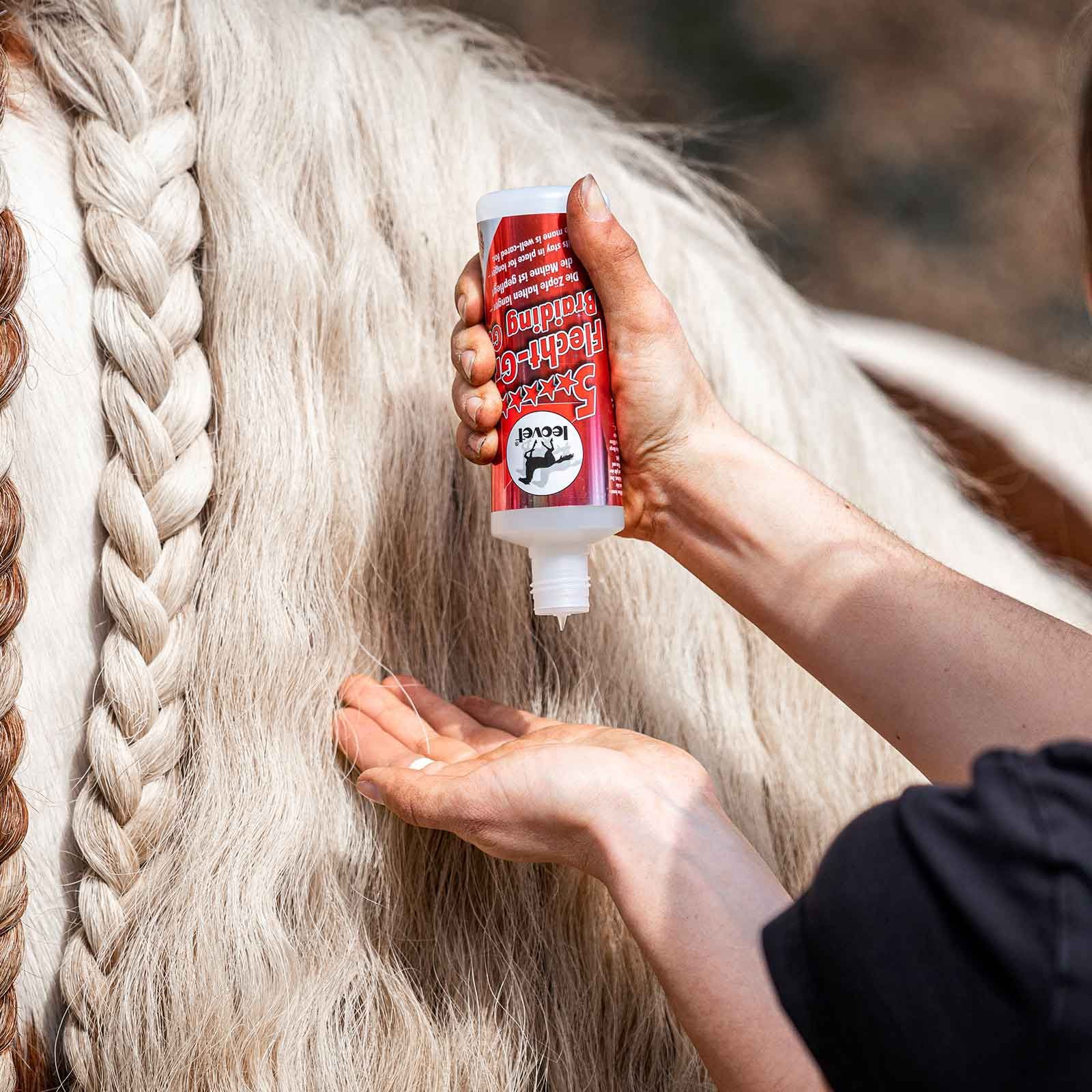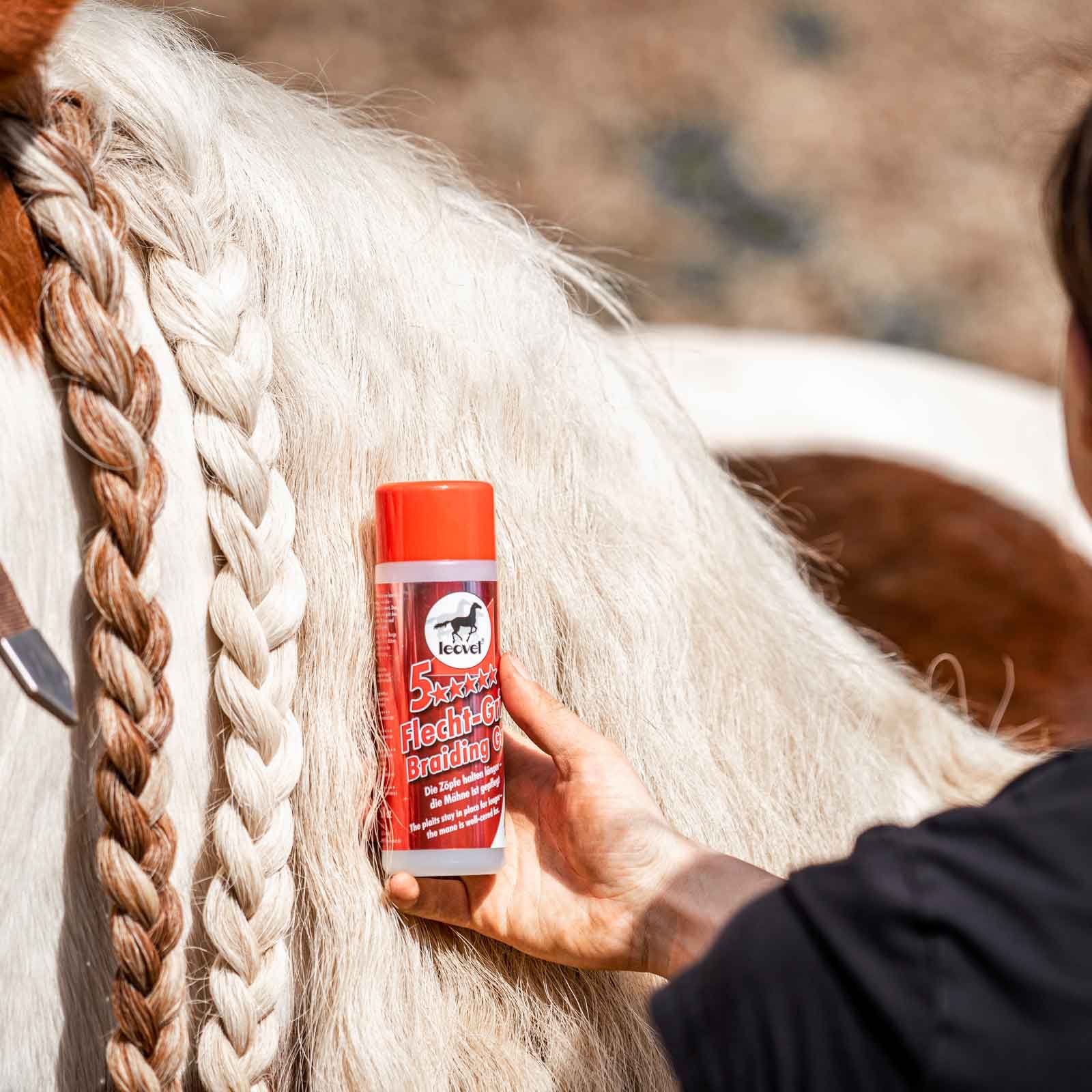 Mit dem speziell für die Mähne konzipierten 5-Sterne Flecht-Grip wird die das Einflechten von Mähne- und Schweif erleichtert. Das Flecht Grip Gel entwirrt, pflegt die Mähne und gibt den nötigen Halt zum Einflechten von Turnierzöpfen. Durch die optimale Griffigkeit halten die Zöpfe länger und unschönes Auseinanderfallen wird vermieden. Es erleichtert bereits das Abtrennen der einzelnen Strähnen und fixiert diese lang anhaltend in perfekten Zöpfen. Das Leovet 5-Sterne Flecht-Grip ist natürlich silikonfrei.