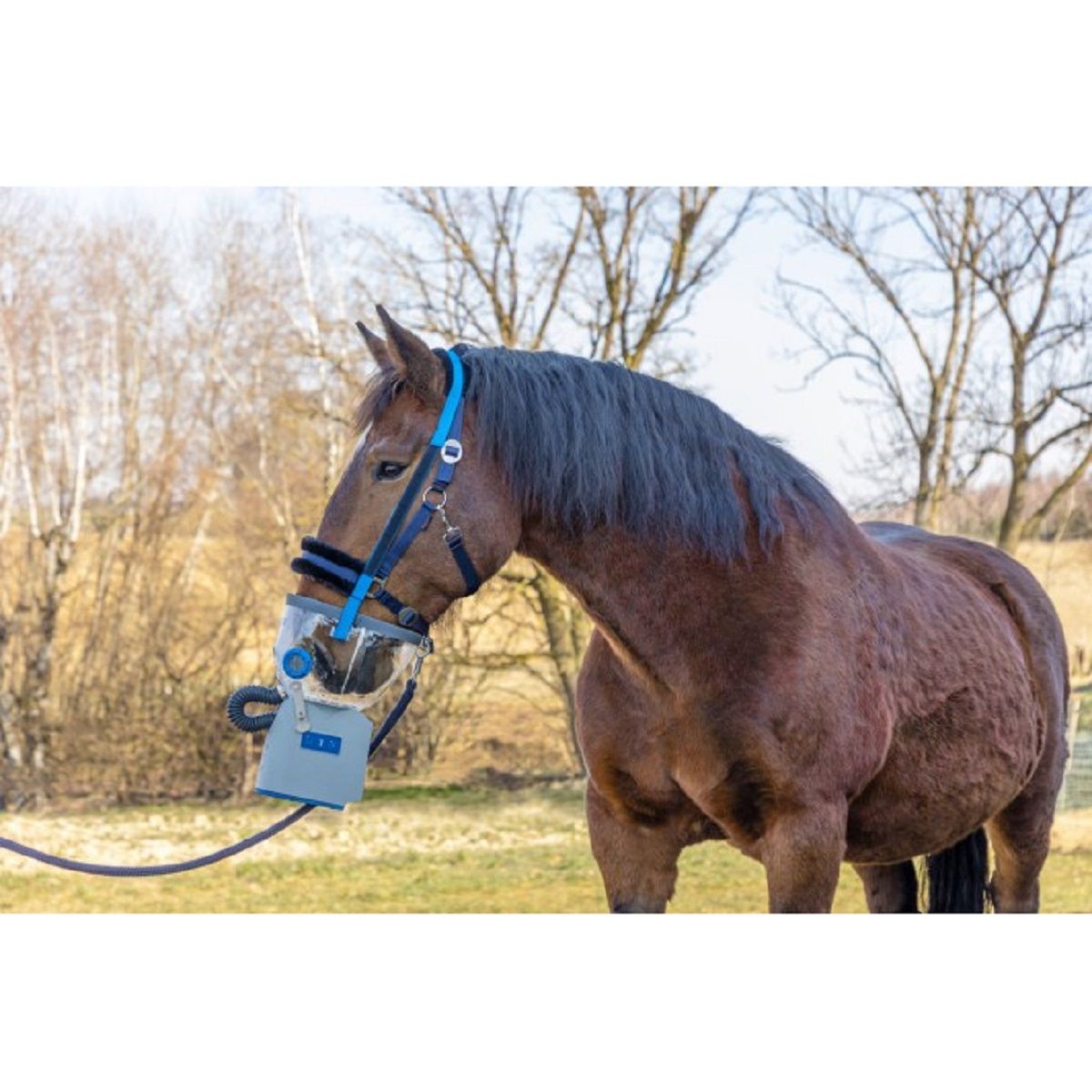 Der weiche, abnehmbare Dichtungsring schmiegt sich an das Pferdemaul an und dichtet während dem Therapieprozess gründlich ab. Aus dem Auffangbecken am Boden kann übermäßig produzierter Schleim einfach entfernt werden. Das Rückstoßventil verhindert ungewollten Rückfluss der vernebelten Präparate. Das Frischluftventil der Inhalationsmaske sorgt für die individuelle Regulation der Frischluftzufuhr. Die seitlichen Ventile zum Ausstoßen der Atemluft sind abnehmbar und einfach zu reinigen.