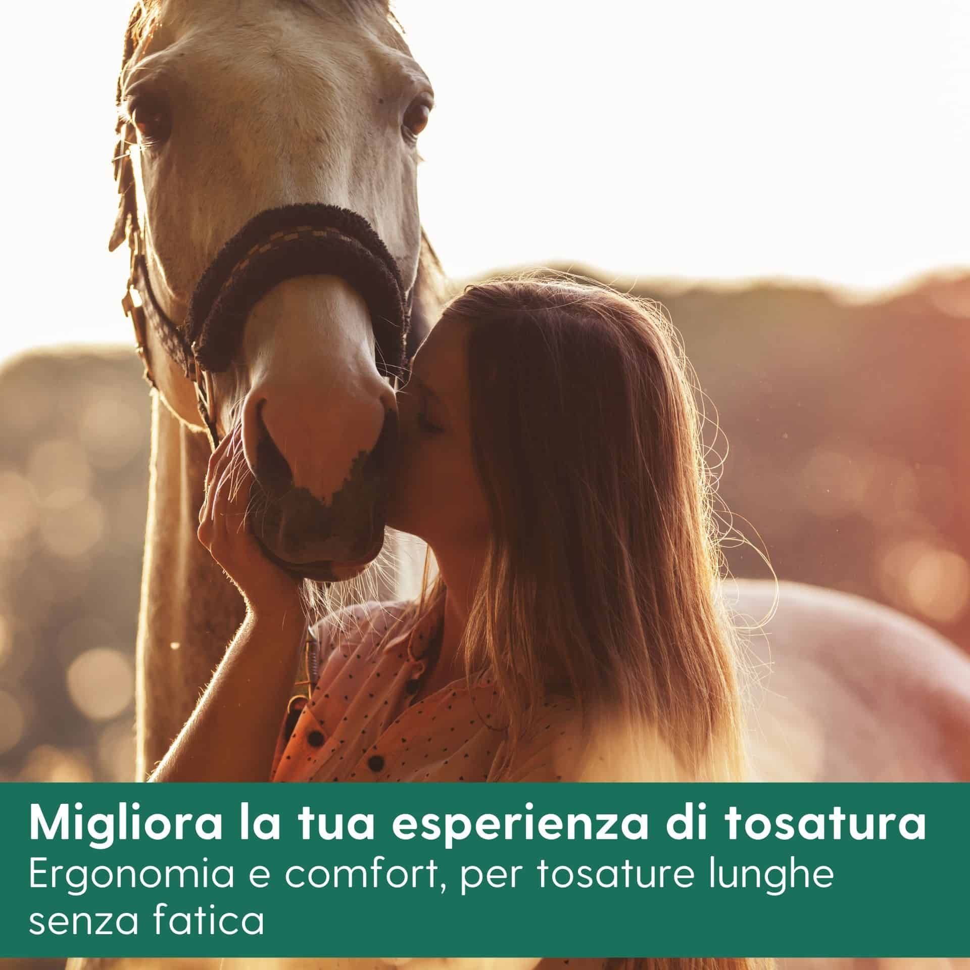 Mit einer Länge von 29,5 cm und nur 900 g Gewicht ist die kabellose Pferdeschermaschine im Vergleich zu anderen Modellen wesentlich leichter, sehr kurz, extrem handlich und durch ihr ergonomisches Design gut ausbalanciert. Die Aesculap Bonum Schermaschine für Pferde ist mit ihrem schlanken Gehäuse auch sehr gut für kleinere Hände geeignet. Die versenkte Ein-/Ausschalt-Drucktasteverhindert ein versehentliches Ein- oder Ausschalten des Gerätes während des Schervorganges.
