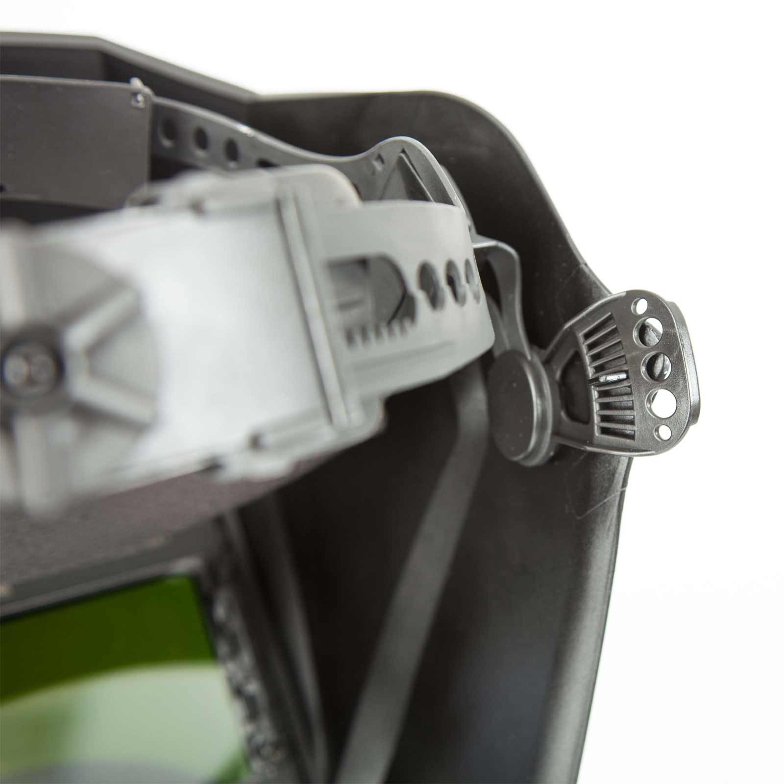 Die Schutzstufe (Verdunkelungsgrad für optimale Sicht, je nach Schweißverfahren bzw. Lichtbogenstärke) und das Ansprechverhalten (Empfindlichkeit) des Sichtfeldes sind jederzeit stufenlos mittels Reglern an der Helmaußenseite einstellbar - eine Hand bleibt frei für den Schweißbrenner.