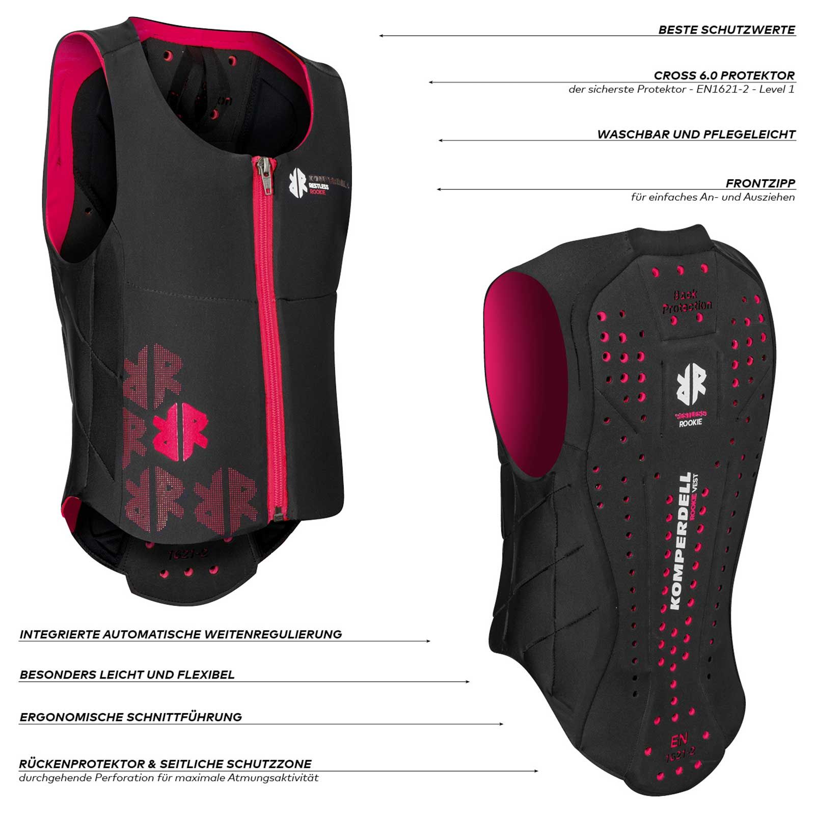 Der EN 1621-2 – Level 1 geprüfte Rückenprotektor mit Rippenschutz bietet durch die leichte Bauweise und das schlanke Design optimale Bewegungsfreiheit und einen sehr angenehmen Tragekomfort. Auch das tolleDesign für kleine Reiter-Mädels fehlt beim Komperdell Rückenprotektor für Kinder nicht. Die durchgehende Perforation der Schutzzonen sorgt für beste Atmungsfähigkeit. Die Reit-Sicherheitsweste von Komperdell ist mit einem Front-Reißverschluss ausgestattet, dieser erlaubt einfaches An- und Ausziehen des Protektors.
