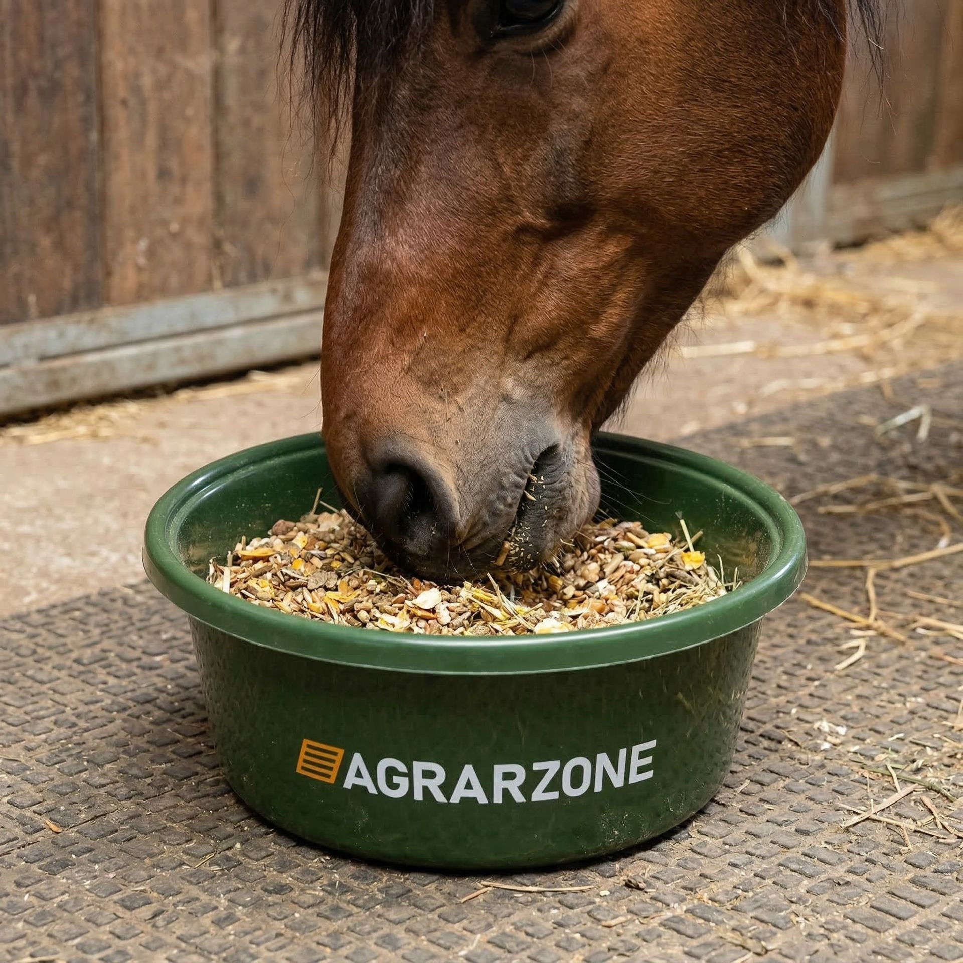Die vielseitig einsetzbare Futterschüssel für Pferde eignet sich hervorragend zur Fütterung von Müsli, Hafer, Pellets und anderen Futtermitteln.