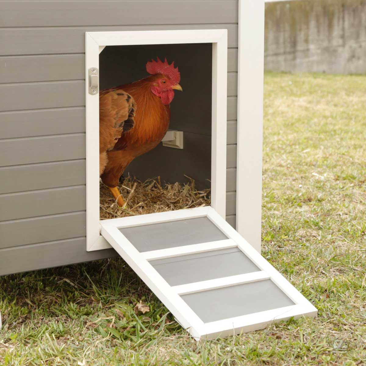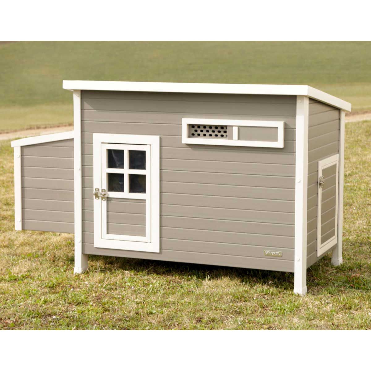 Das besondere am Hühnerstall Barney ist das wetterfeste und langlebige ECO-Kunststoff Material aus 60% Kunststoff und 40% Holz. Jetzt im Set mit passendem Freigehege.
