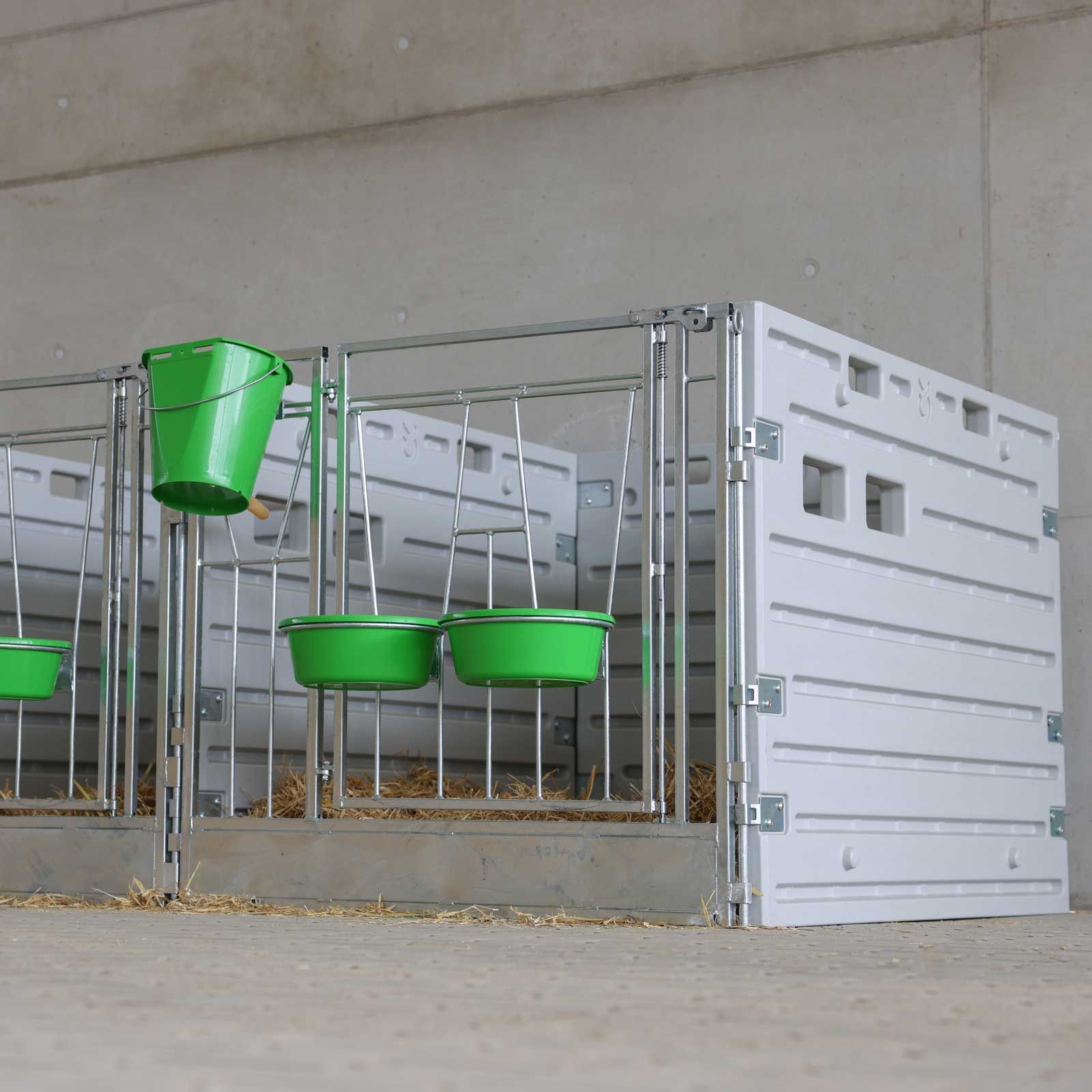 Die Seitenwände der Kälberbox sind mit einer Sozialkontaktöffnung ausgestattet, die es dem Kalb ermöglicht, Kontakt zu anderen Kälbern aufzunehmen. Das Frontelement verfügt über eine durchschwenkbare Drehtür und einen feststehenden Tränkebereich, der ideal zum Anlernen der Kälber an Nuckeltränken ist. Die Kälberboxen sind außerdem mit einer Tränkeeimerhalterung und zwei klappbaren Eimerhalterungen ausgestattet.