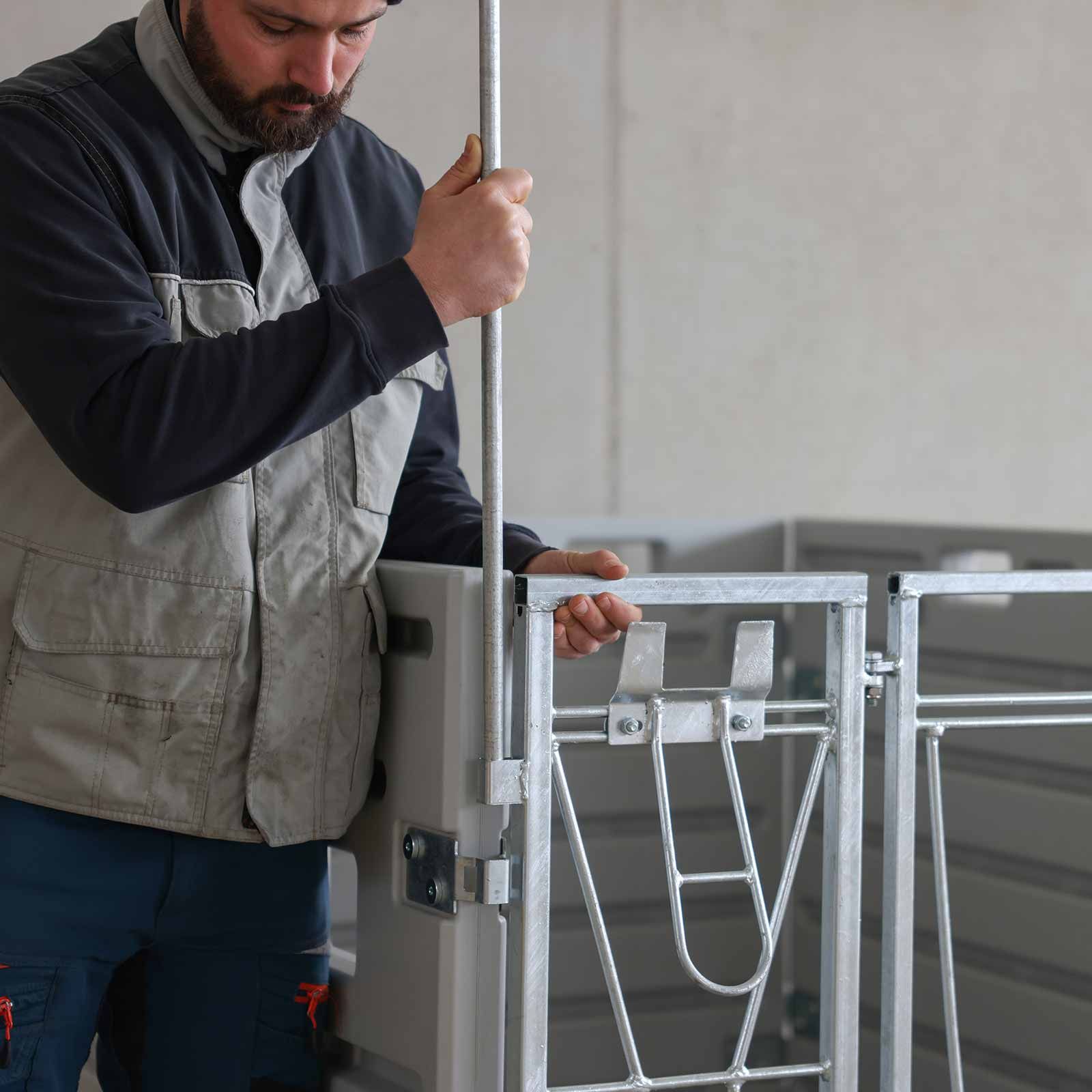 Die Kälberbox Einzelbucht kann freistehend eingesetzt werden und ist für eine Person schnell und einfach aufzustellen. Die 3 Panele und das Frontelement lassen sich mühelos verbinden, um schnell eine neue Einzel-Kälberbox zu schaffen. Bei Bedarf lassen sich einzelne Boxen für eine Gruppenhaltung auch verbinden indem ein Seitenteil entfernt wird und die Boxen mit den Verriegelungsstäben verbunden werden.