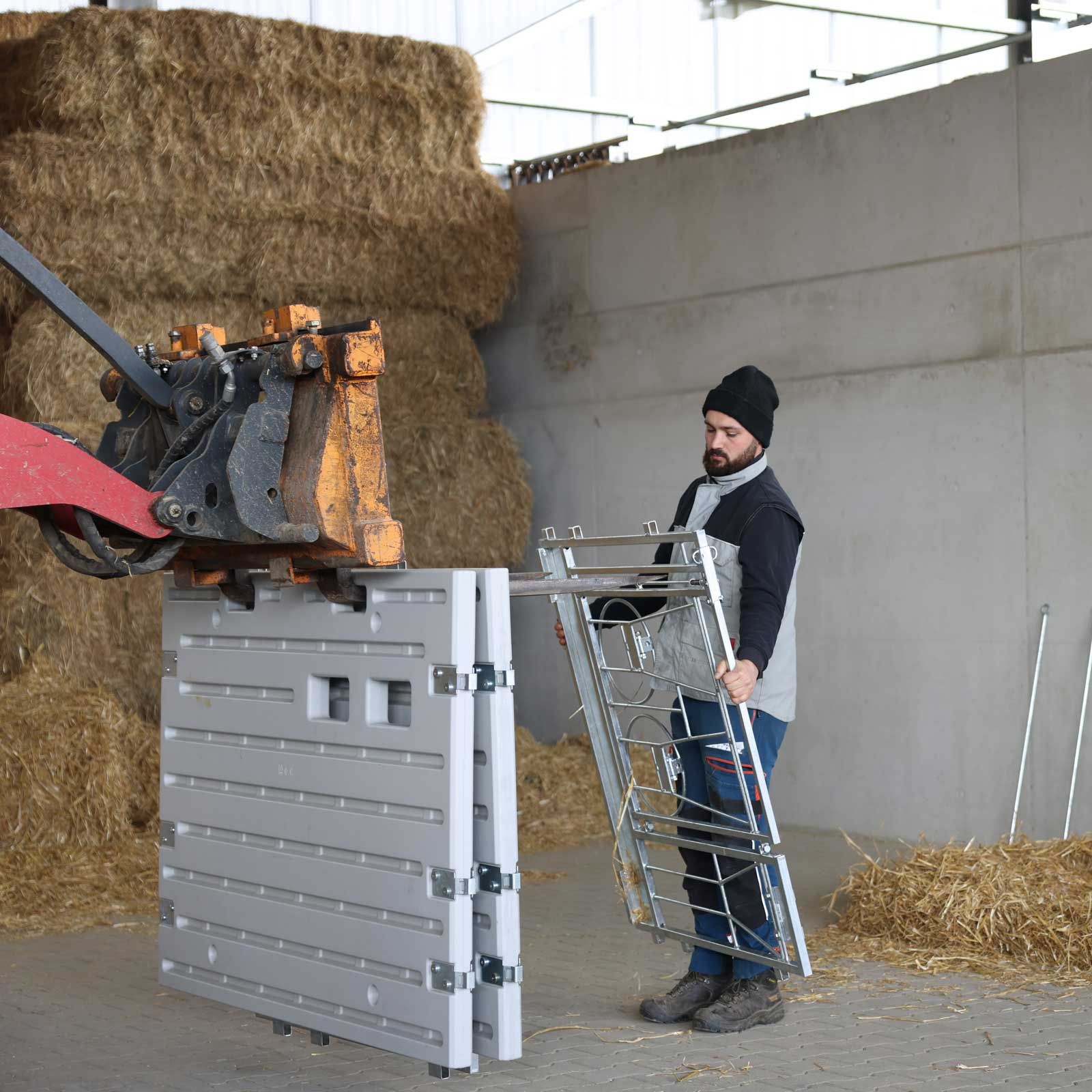 Der Auf- und Abbau der modularen Kälberbox sind ebenso einfach wie schnell. Die Griffe an den Panelen sind groß genug, um sie auch auf eine Palettengabel aufzureihen. Das neue einzigartige Stapelsystem ermöglicht die platzsparende Sortierung und Lagerung der Panele, inklusive des Türelements.
