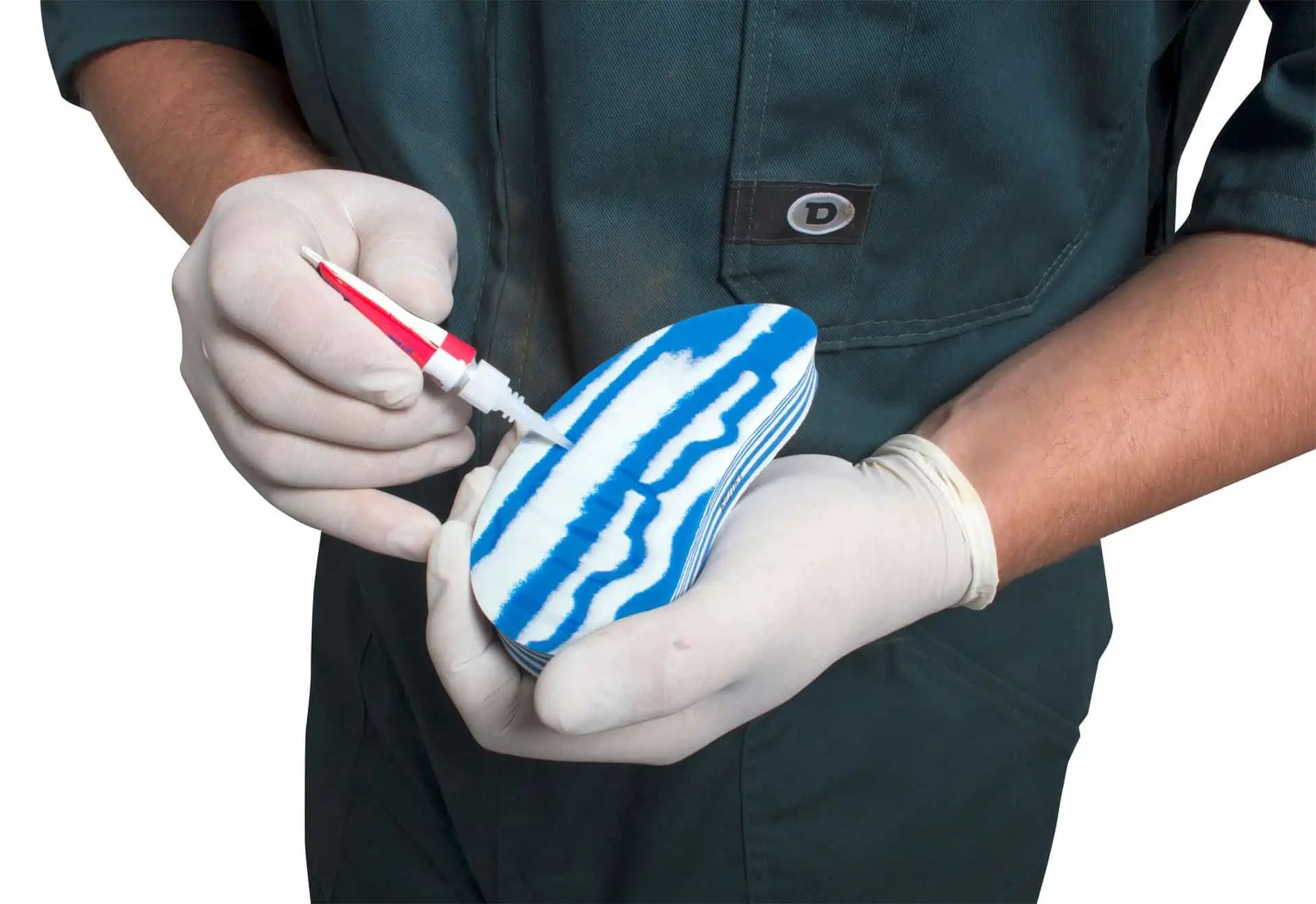 - extrem einfach - gesäuberte Klaue mit spezieller Raspel bearbeiten - Kleber auf Klotz auftragen - ca. 10 Sekunden anpressen - fertig!