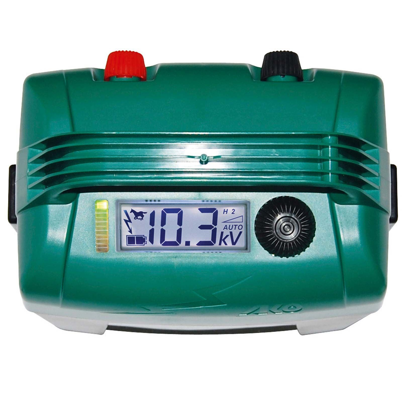 Die Fohlenschaltung kann der Anwender je nach Bedarf aktivieren. Sollte sich ein Tier im Zaun verfangen, wird durch einen wesentlich verlängerten Impulsabstand (auf 60 sec.) dafür gesorgt, dass das Tier nicht übermäßig belastet wird und die Wahrscheinlichkeit steigt, dass es sich wieder selbst befreien kann. Parallel dazu gibt das Gerät einen akustischen Alarm und signalisiert die Situation auch optisch im Display. Das große Display auf der Oberseite des Gerätes liefert dem Anwender alle wichtigen Informationen auf einen Blick, sogar bei Dunkelheit. Minimaler Stromverbrauch durch optimale, selbstständige Anpassung der Ausgangsleistung an Zaunlänge und Zaunzustand, dass ist der Automatikmodus des Weidezaungerätes. Der Batterieverbrauch ist auf diese Weise minimal, die Hütewirkung bleibt über einen sehr großen Bereich der Zaunbelastung optimal.