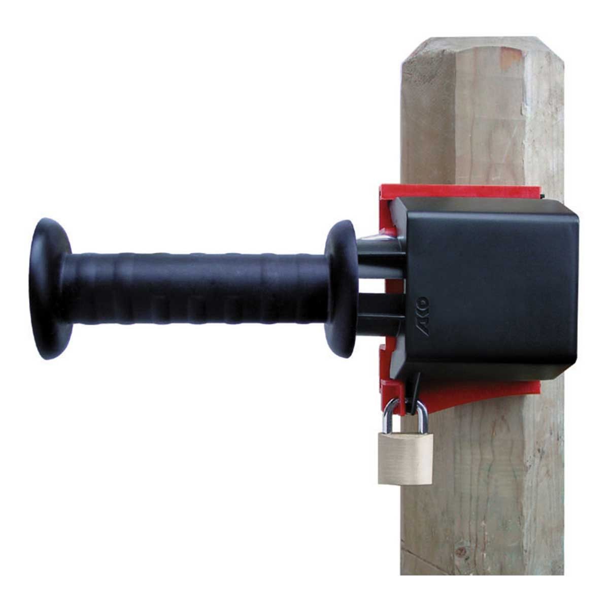 Das abschließbare Torsystem: Torgriff in die Anschlussplatte einhängen - Sicherheitsabdeckung zuschieben - Vorhängeschloss zusperren - fertig! Der Torgriff ist somit fest im verschlossenen Sicherheitsgehäuse verankert und nur Befugte erhalten Zugang zur Weide.