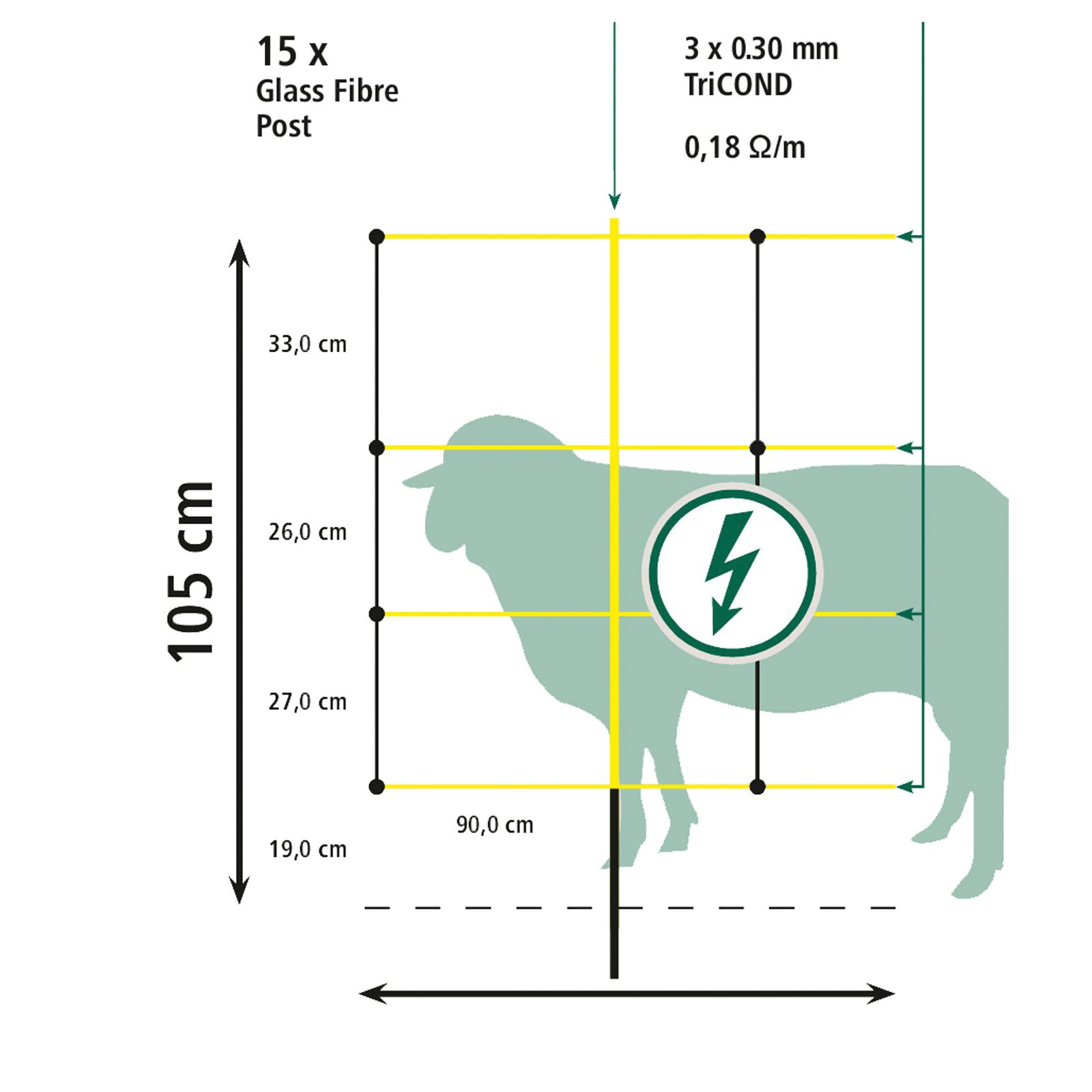 Hinweis: Das Schafnetz EasyNet bietet durch Verwendung der AKO TriCOND-Leiterdrähte einen sehr geringen Widerstand. Das führt zu einer sehr hohen Leitfähigkeit. Das Netz ist 50 m lang und beinhaltet 15 Fiberglaspfähle.