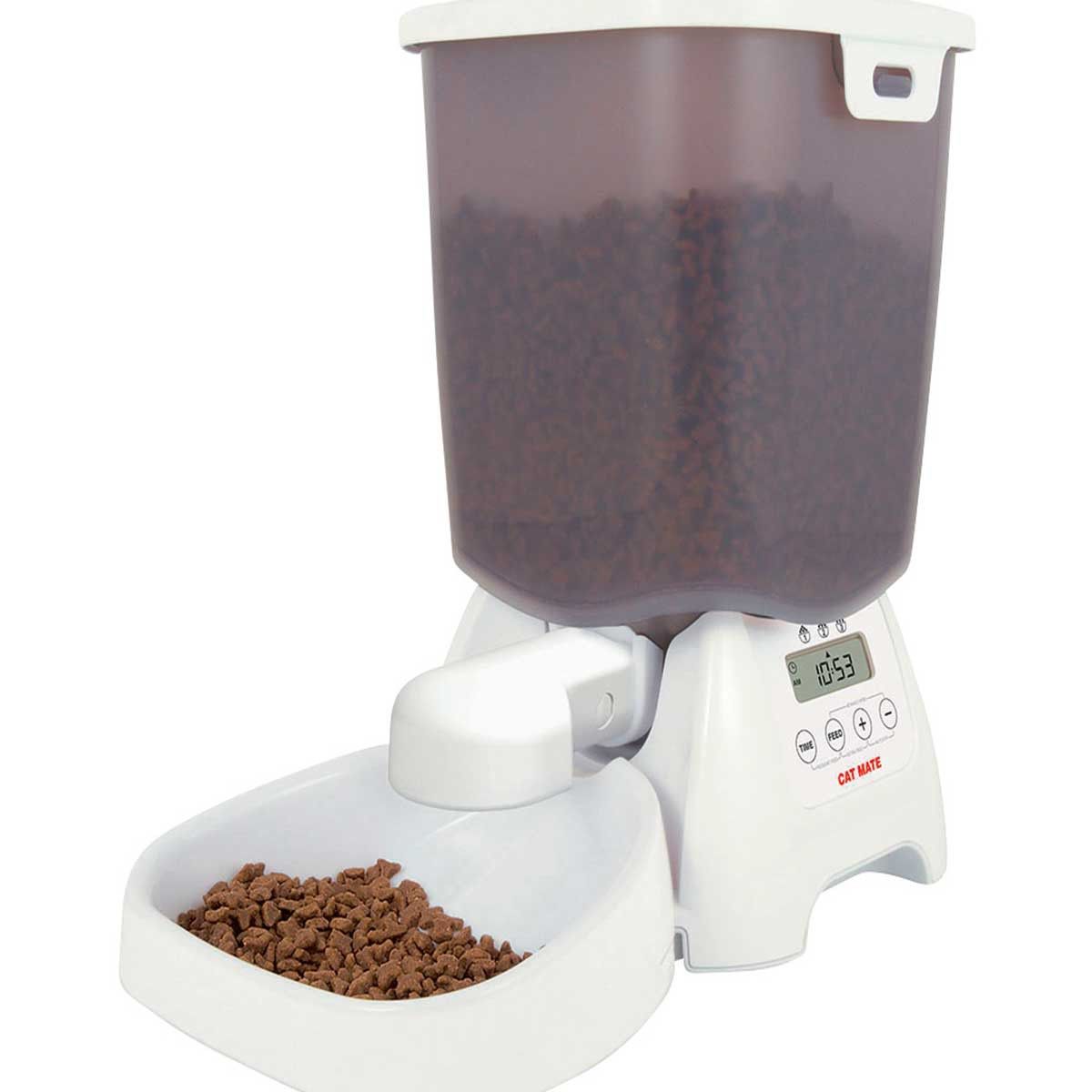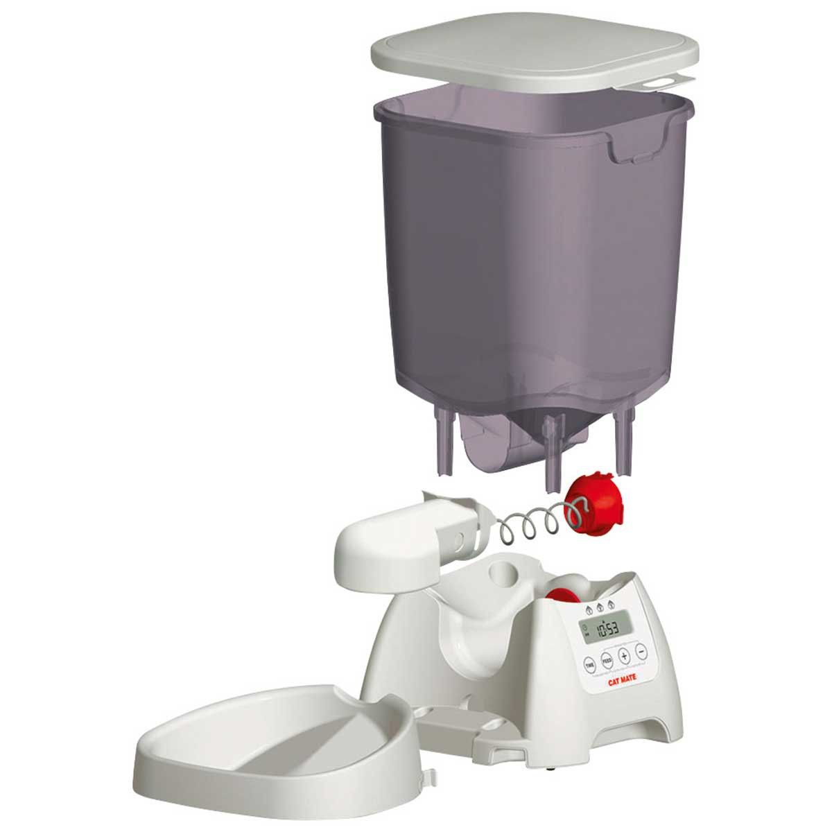 Der Pet-Mate® Trockenfutter-Automat gibt genau die empfohlene Trockenfuttermenge aus, um Gesundheitsrisiken zu minimieren und durch Überfüttern entstehende höhere Kosten zu vermeiden. Der Futterautomat gestattet Ihnen das Programmieren von bis zu drei individuell bestimmten Portionengrößen im Tagesverlauf. Falls gewünscht, können die Futterportionen auch vor ihrer programmierten Zeit ausgegeben werden. Alternativ kann der Futterautomat bei Bedarf auch manuell zur Ausgabe von genau bestimmten Futterportionen verwendet werden, oder in einem „häufigen Fütterungsmodus“ nach spezifischen diätischen Anforderungen, beispielsweise bei Diabetes.