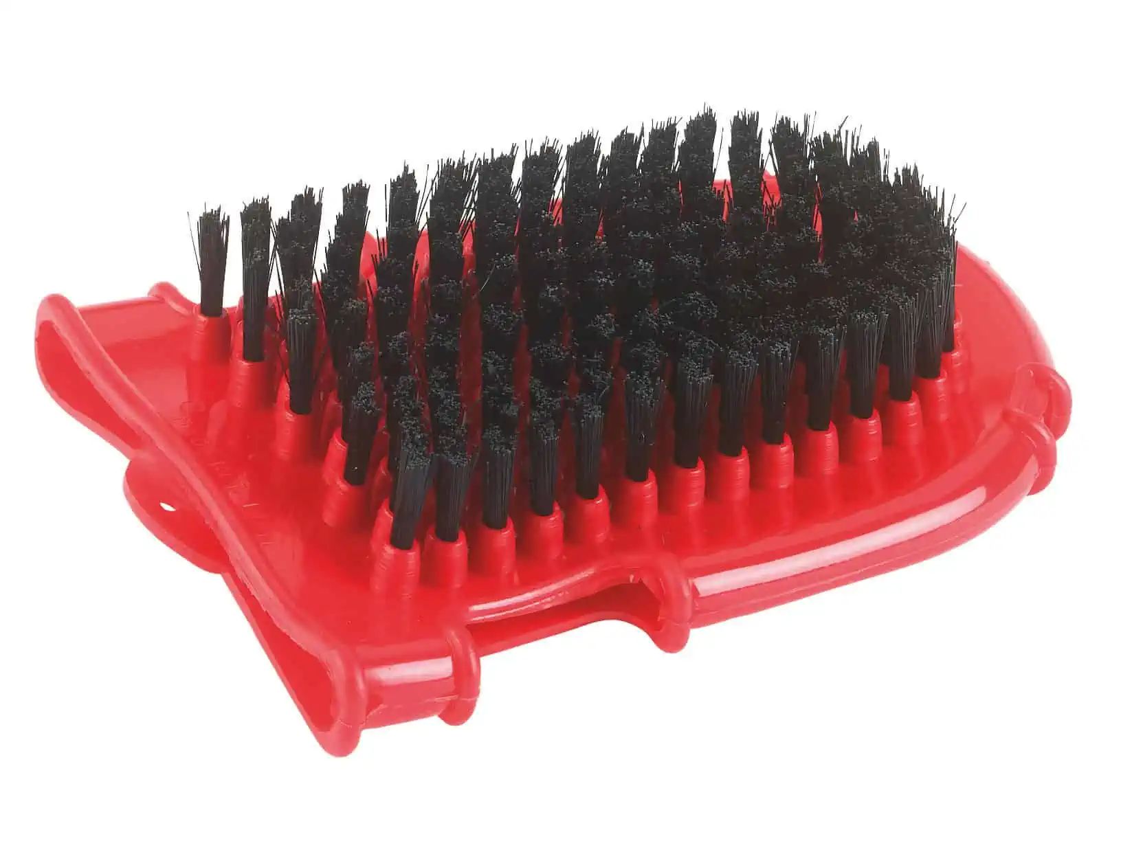 Der Putzhandschuh aus Kunststoff, rot, dient zur effektiven Reinigung und Pflege des Pferdefells. Er entfernt effizient Schmutz und lose Haare und kann auch zur Massage verwendet werden.