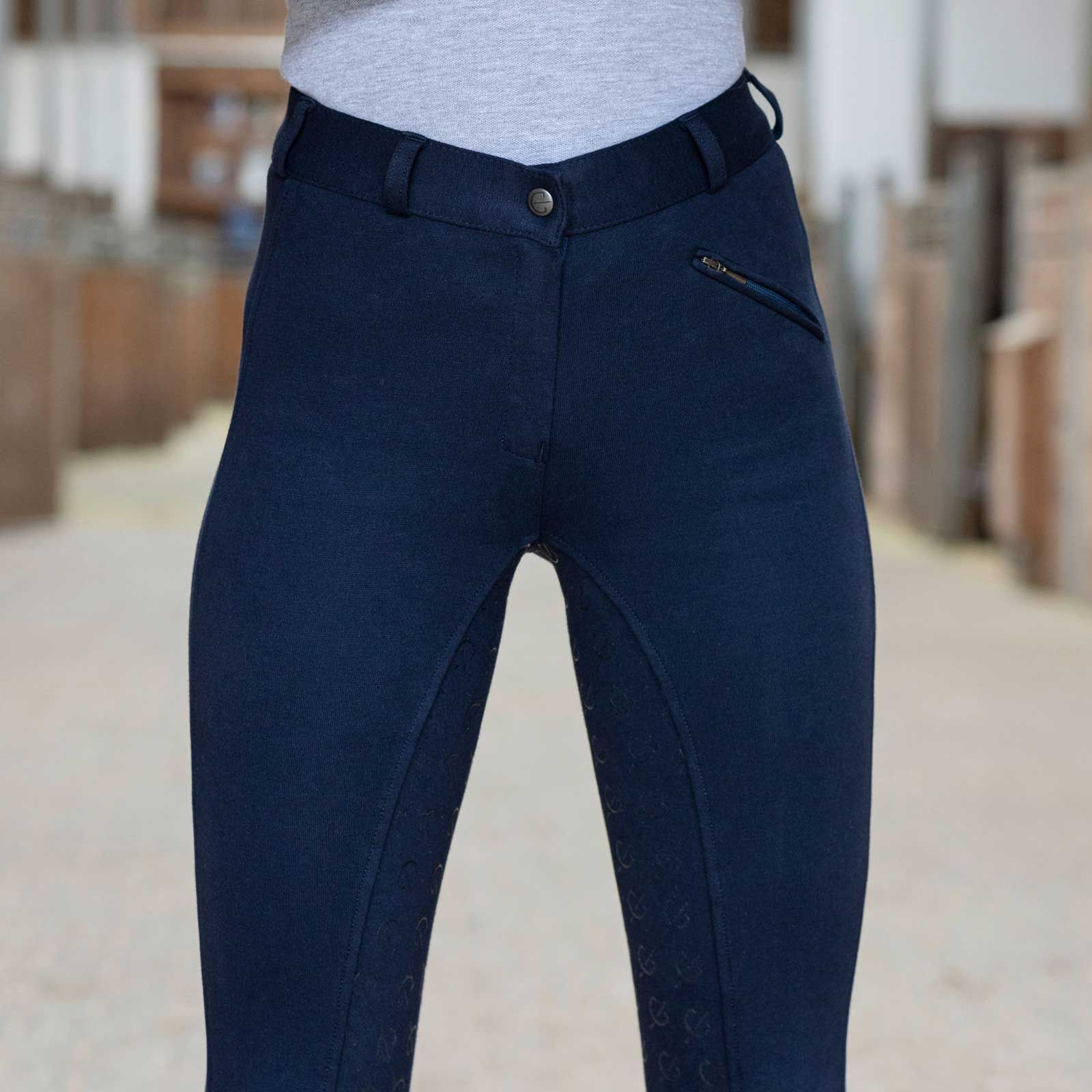 Die Gürtelschlaufen sorgen für eine individuelle Passform, während der organische Baumwollstoff eine hautfreundliche Wohlfühlatmosphäre bietet. Die Reithose verfügt außerdem über eine praktische Reißverschlusstasche, in der kleine Utensilien sicher verwahrt werden können.