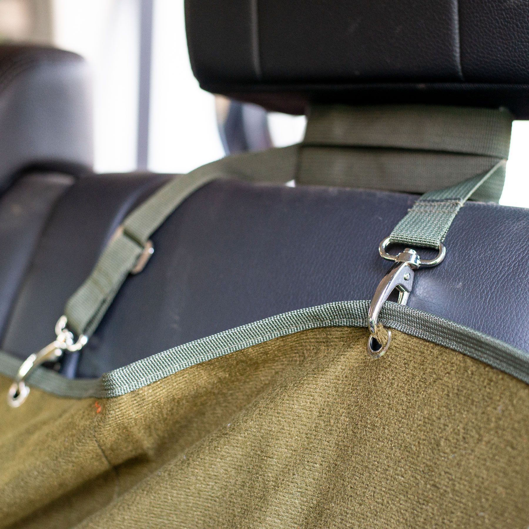 - Einfache Befestigung an Kopfstützen mit Gurten und Klipsen