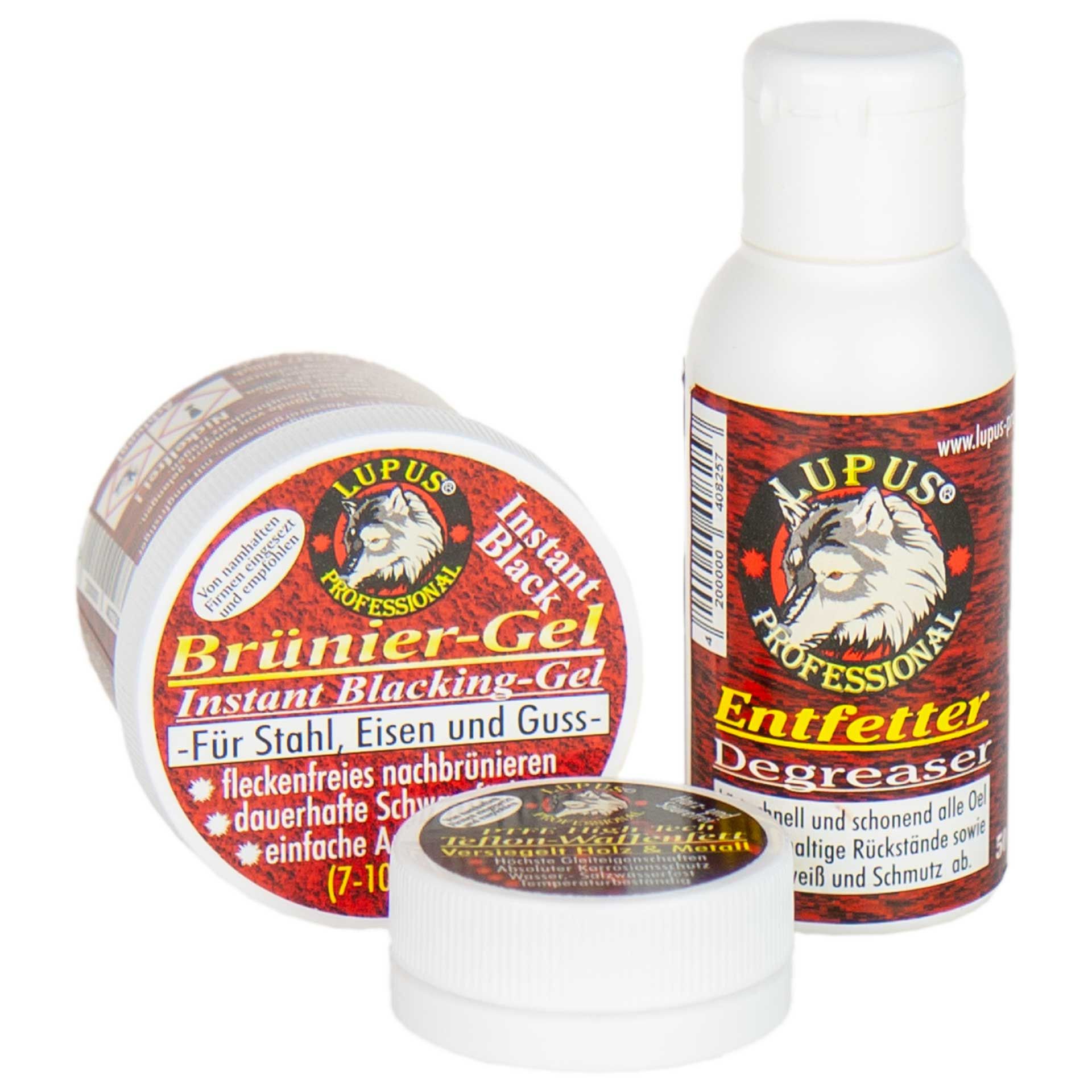 • Menge: Brüniergel (50g), Entfetter (50ml), Waffenfett (10g)