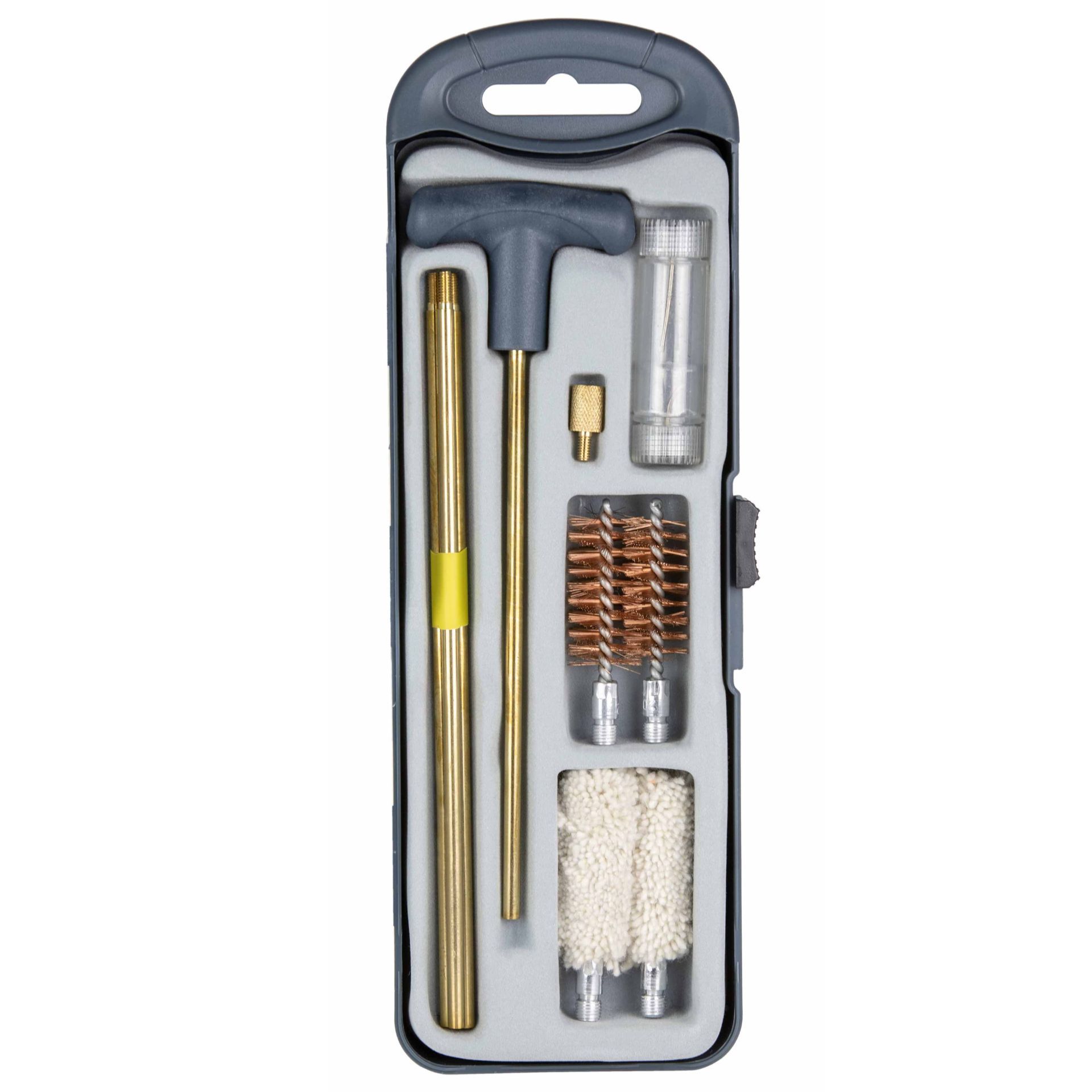 Das Set enthält einen vier-teiligen Reinigungsstab aus Messing mit T-Griff, zwei phosphorbronze Bürsten (12GA, 20GA) mit 5/16-27 Gewinde, zwei Wollbürsten (12GA, 20GA) mit 5/16-27 Gewinde und einen Adapter für den Stab und die Bürste/Reinigungsmopp. Außerdem ist eine Flasche mit zwei getrennten Kammern für Schmiermittel und Reinigungsmittel enthalten.