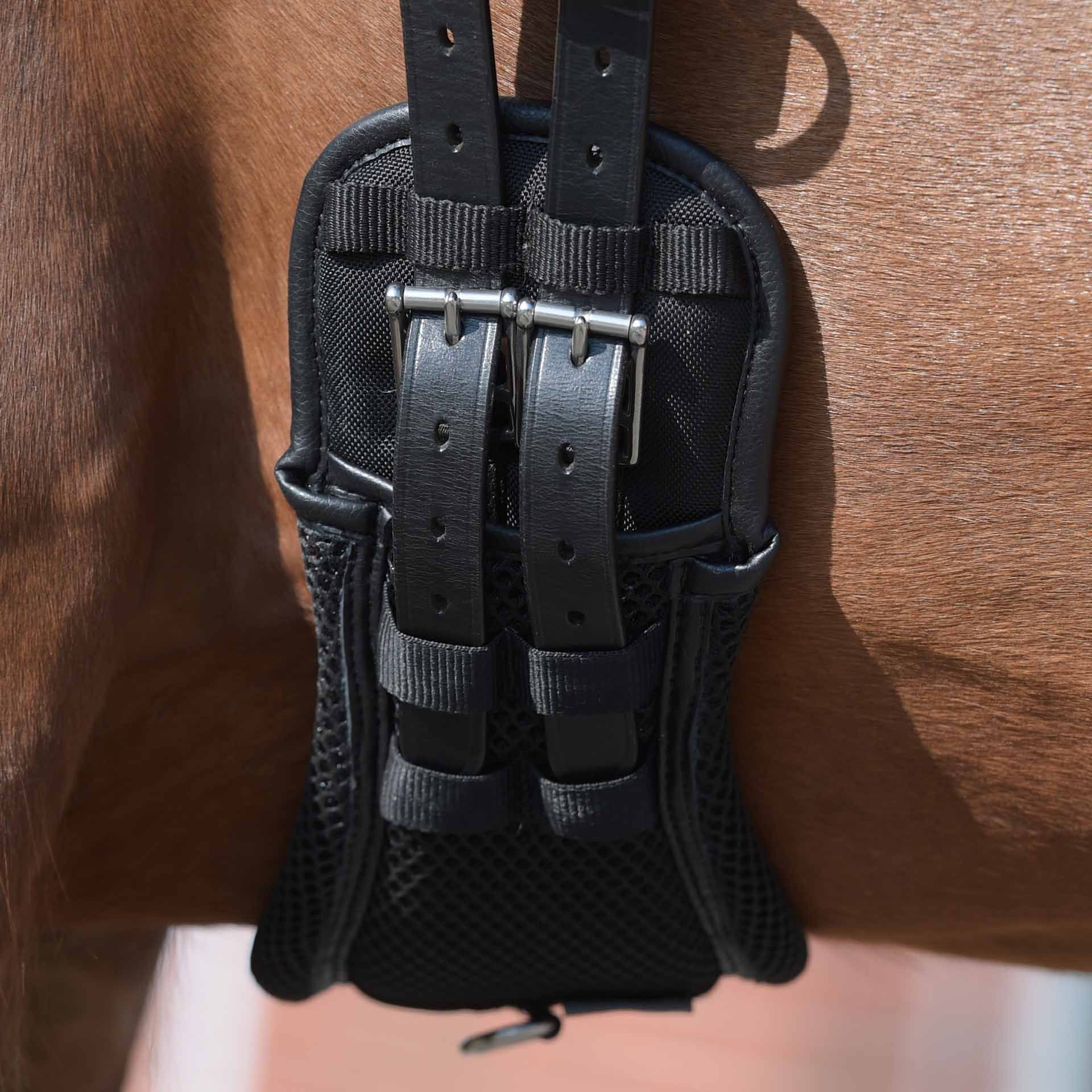 Der mittig positionierte D-Ring ermöglicht das schnelle Einschnallen von Hilfszügeln. Darüber hinaus sorgt die optimierte Gurtstrupfenführung für eine ideale Positionierung bei unterschiedlichen Gurtungssystemen der Sättel. Die Expert-Schnallen, Dornschnallen aus Edelstahl mit extrem langlebigen Rollen ohne Schweißnaht, schonen die Sattelgurtstrupfen und ermöglichen ein besonders flaches Gurten.