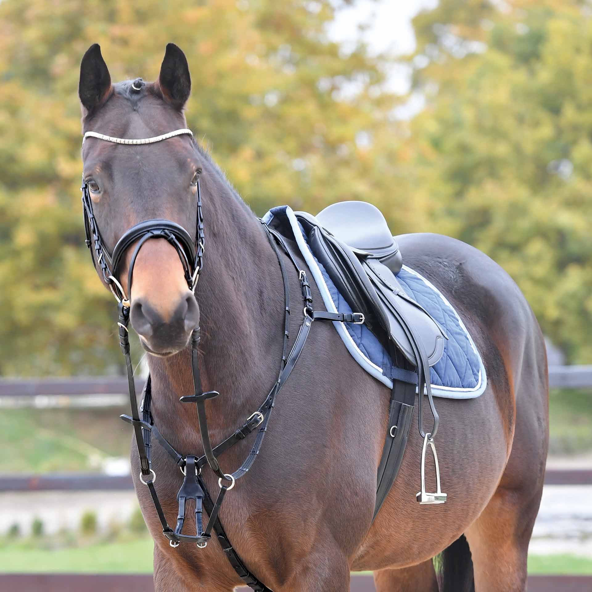 - längeneinstellbarer, unterpolsterter Sattelgurtriemen zum Öffnen und mit flachem Trensen-Karabinerhaken zu befestigen