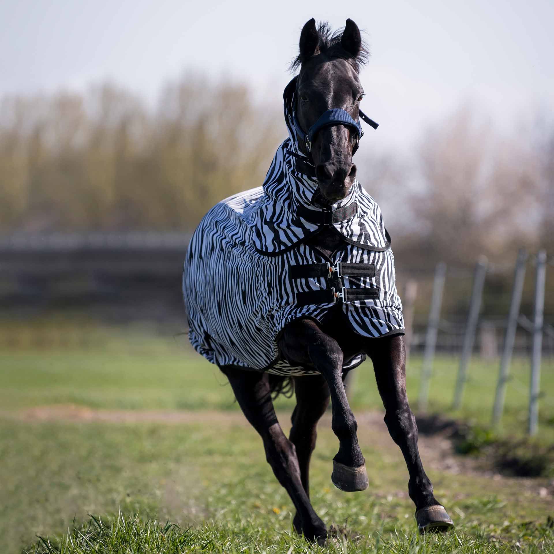 Die BUSSE Outdoor-Fliegendecke COMFORT PRO ZEBRA bietet optimalen Schutz vor Fliegen und Bremsen bei Stall-, Weide- und Paddockhaltung. Dazu kommt das schwarz-weiße Zebra-Muster, welches für einen natürlichen Anti-Bremsenschutz sorgt. Studien haben gezeigt, dass Pferde durch dieses Muster von Pferdebremsen nicht mehr als Ziel anvisiert werden.