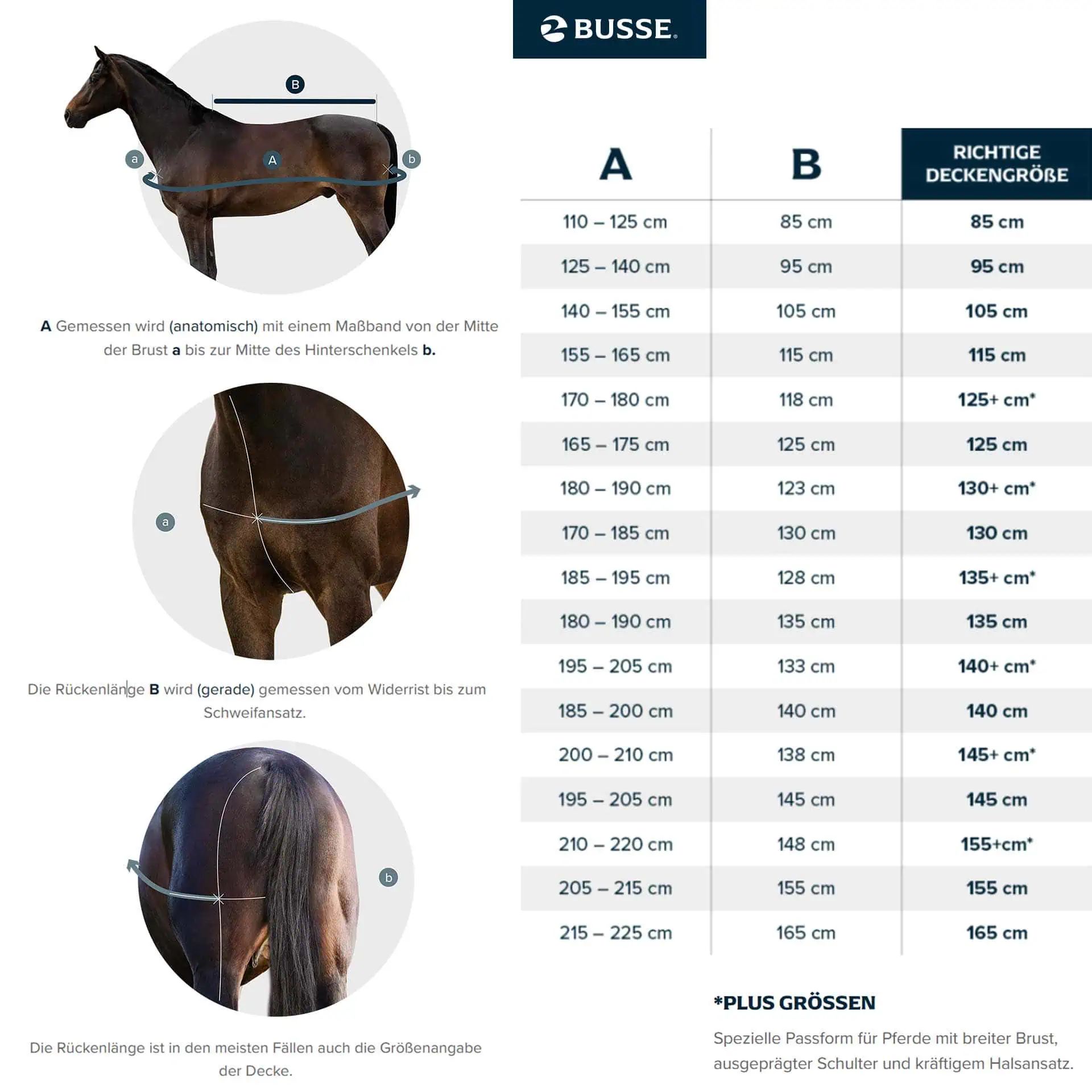 BUSSE Liner NOORVIK PRO II 200 – Optimale Ergänzung für Ihr Pferdedecken-System Die BUSSE Liner NOORVIK PRO II 200 ist eine Unterziehdecke zur individuellen, flexiblen und situativen Erweiterung der BUSSE-Outdoordecken. Sie ist fest integrierbar in allen Outdoordecken FLEXIBLE und FLEXIBLE PRO, in allen Outdoordecken ACTIVE und ACTIVE PRO sowie in allen Outdoordecken WINDCHILL. Die Decke besteht aus einem erprobten Außenmaterial von 420 den Polyester und ist atmungsaktiv, kuschelig leicht und anschmiegsam. Mit einer mittleren Wärmeisolierung von 200g Polyfill bietet sie optimalen Schutz bei kalten Bedingungen. Darüber hinaus verfügt sie über ein DRYsense-Lining, ein besonders fellfreundliches und schnelltrocknendes Polyestergewebe. Dies sorgt für eine soft-trockene Haptik auch bei wetterbedingter hoher Luftfeuchtigkeit. Der BUSSE Liner NOORVIK PRO II 200 wurde speziell ohne Rückenmittelnaht entwickelt, um einen optimalen Sitz unter den Überdecken zu gewährleisten und jegliches Scheuerpotential zu vermeiden. Weitere Merkmale sind die zweckoptimierte Seitentiefe, Kammersteppung und das extra weiche Einfassband. Die Decke kann mit vier stabilen Klettschlaufen in den oben genannten BUSSE-Outdoordecken befestigt werden. Die Unterziehdecke verfügt über einen flachen T-Verschluss im Brustbereich, der wenig unter den Überdecken aufträgt. Tief angebrachte D-Ringe inklusive einer Hinterhandkordel sorgen für eine optimale Verbindung mit den BUSSE-Outdoordecken. Bei Verwendung als Liner unter einer Outdoordecke können die Kreuzgurte abgenommen werden, und bei Verwendung der Kreuzgurte kann die Decke auch als leichte Stalldecke genutzt werden. Überblick: Flexible Unterziehdecke zur Erweiterung von BUSSE-Outdoordecken Aus 420 den Polyester, atmungsaktiv und kuschelig Mittlere Wärmeisolierung durch 200g Polyfill-Füllung DRYsense-Lining für schnelle Trocknung und angenehmes Gefühl Technische Daten: Material: 420 den Polyester, 200g Polyfill, DRYsense-Lining Ausstattung: T-Verschluss im Brustbereich, tiefe D-Ringe, Hinterhandkordel, kreuzbegurtung, 4 stabile Klettschlaufen Lieferumfang: 1x BUSSE Liner NOORVIK PRO II 200 FAQ Was sind die Vorteile der BUSSE Liner NOORVIK PRO II 200?Die BUSSE Liner NOORVIK PRO II 200 bietet viele Vorteile. Sie ist aus 420 den Polyester hergestellt, atmungsaktiv und sehr bequem. Ihre mittlere Wärmeisolierung durch eine 200g Polyfill-Füllung und das DRYsense-Lining sorgen für Schutz und Wohlbefinden des Pferdes. Außerdem lässt sich die Unterziehdecke flexibel in verschiedene BUSSE-Outdoordecken integrieren bzw. kann eigenständig als leichte Stalldecke genutzt werden. Für wen eignet sich die BUSSE Liner NOORVIK PRO II 200 besonders?Die BUSSE Liner NOORVIK PRO II 200 ist besonders geeignet für Pferdebesitzer, die ihr Deckensystem flexibel an wechselnde Witterungsbedingungen anpassen möchten, ohne Kompromisse beim Komfort und Schutz des Pferdes eingehen zu müssen. Wie wähle ich die richtige Größe für meinen Liner aus?Um Scheuer- und Druckstellen zu vermeiden, sollte der Liner unter einer Outdoordecke genau richtig sitzen. Er sollte kürzer sein als eine normale Abschwitzdecke, um ein Verrutschen zu verhindern. Auch wenn es möglicherweise ungewohnt erscheint, ist dies bewusst so gewählt, um ein vollsaugen mit Wasser und Schmutz zu vermeiden. Es ist daher entscheidend, die richtige Größe für den Liner zu wählen. Messe am besten nach und vergleiche dann mit unserer Größentabelle, um sicherzugehen.