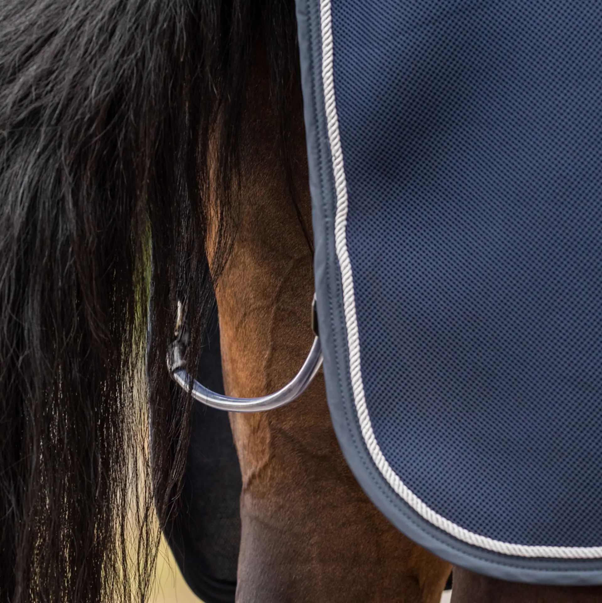 Die BUSSE Abschwitzdecke 3D AIR PREMIUM verfügt über eine anatomische Passform und optimale Liegeeigenschaften durch eine Rückenmittelnaht. Sie hat ein weiches Widerristpolster aus Kunstfell, eine elastische Hinterhandfixierung mit Schmutzschutz und einen formstabilen, eleganten Satin-Einfass mit silberfarbener Zierkordel. Der T-Verschluss mit Abdeckung im Brustbereich und die satinierte, längeneinstellbare Kreuzbegurtung mit T-Verschluss, die durch ein praktisches und innovatives Klettsystem abnehmbar ist, runden das Design ab.