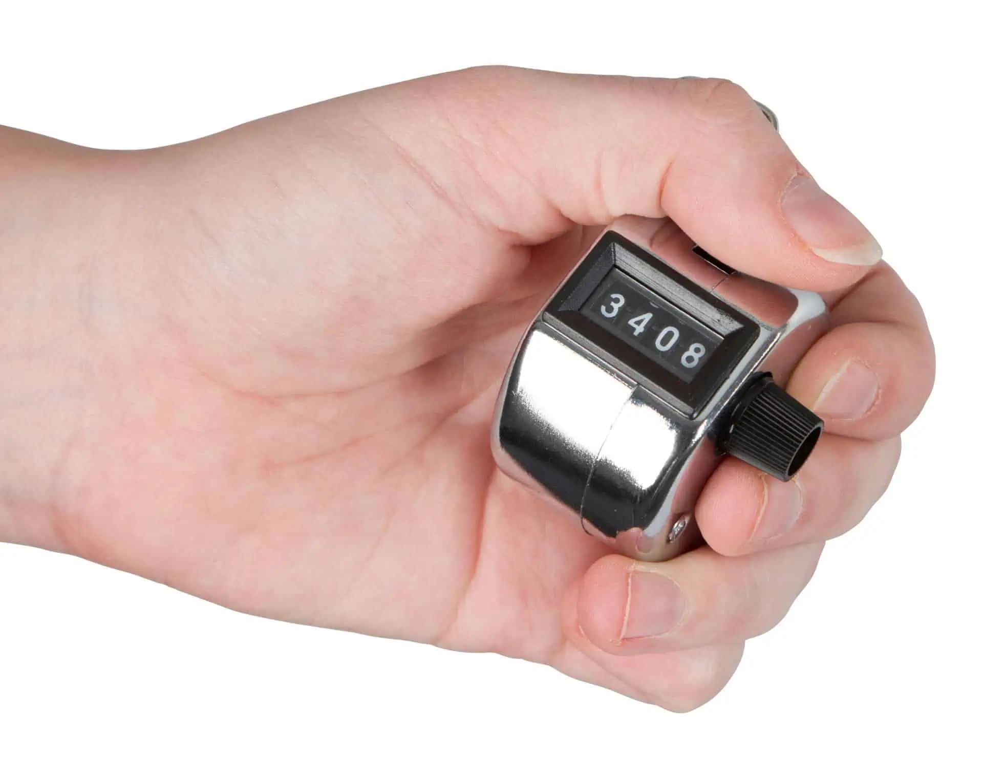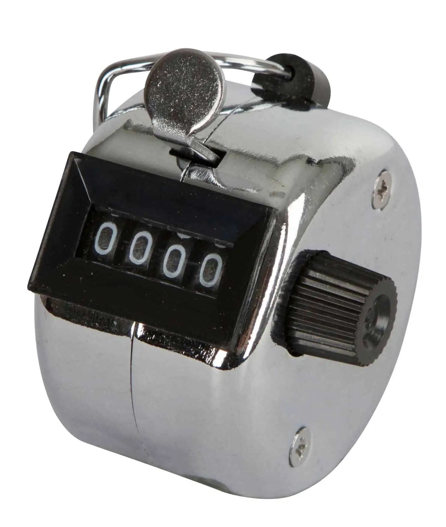 Der Handtierzähler besteht aus einem robusten, verchromten Metallgehäuse.