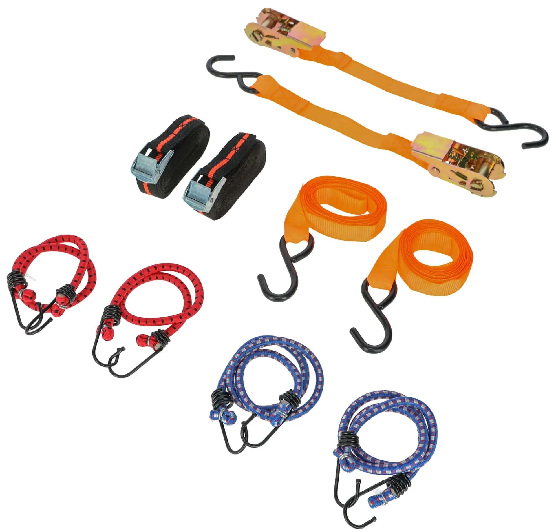 Das Set enthält 4 Expander und 4 Zurrgurte in verschiedenen Ausführungen mit Klemmschloss, Ratsche und S-Haken.