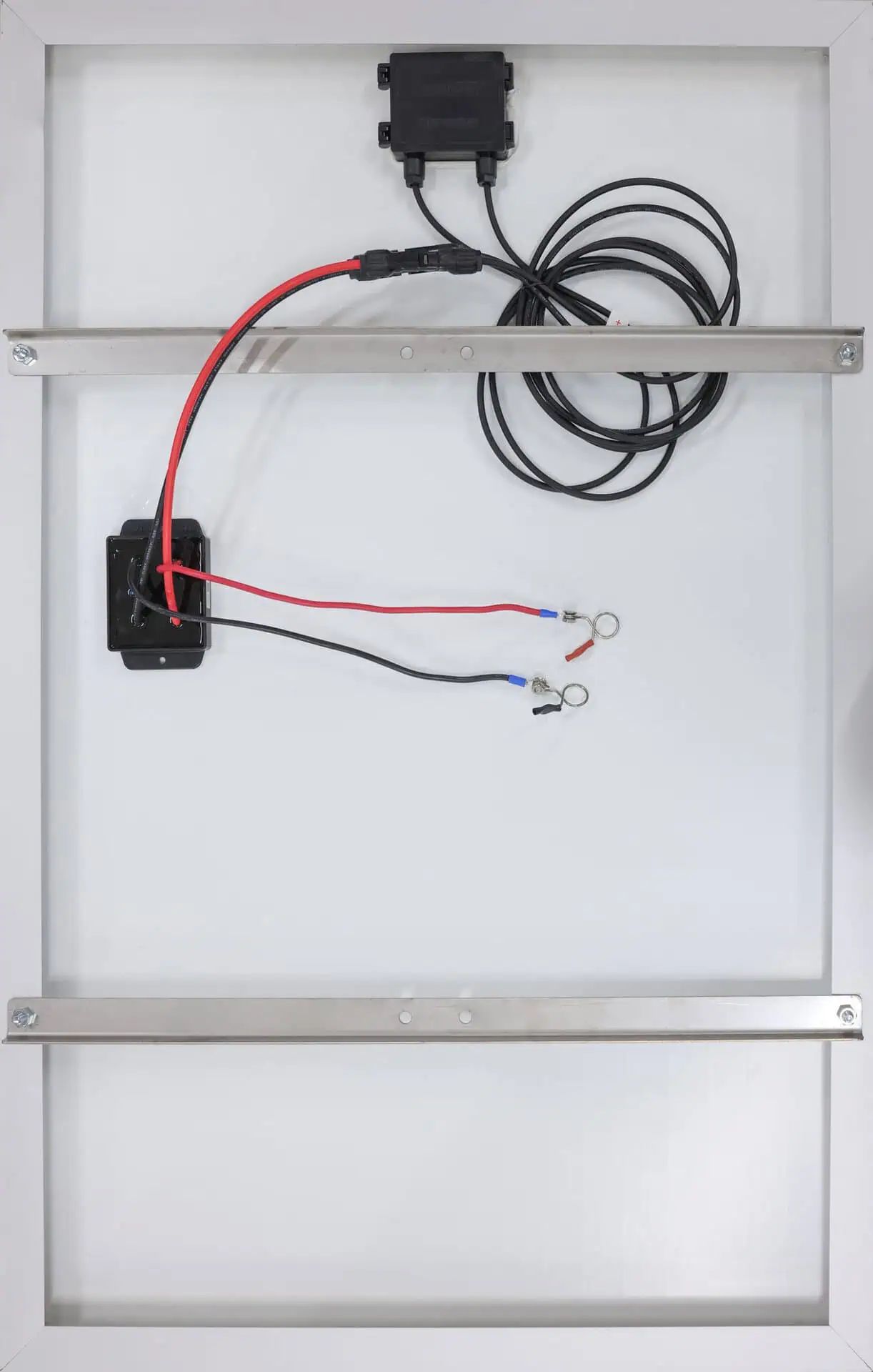 Das Set besteht aus einem hochwertigen Solarpanel, einem Laderegler und zwei Edelstahl-Horizontalstreben für eine stabile Montage. Die 2 m Solarkabel ermöglichen eine flexible Installation.