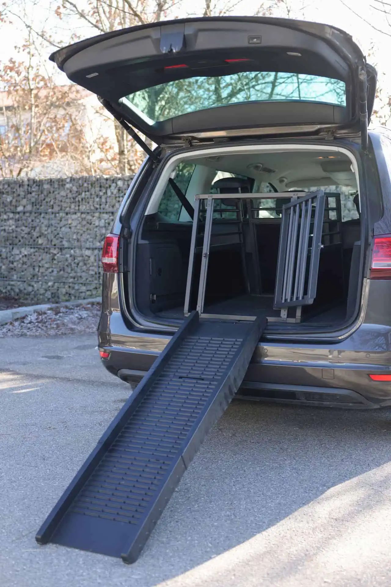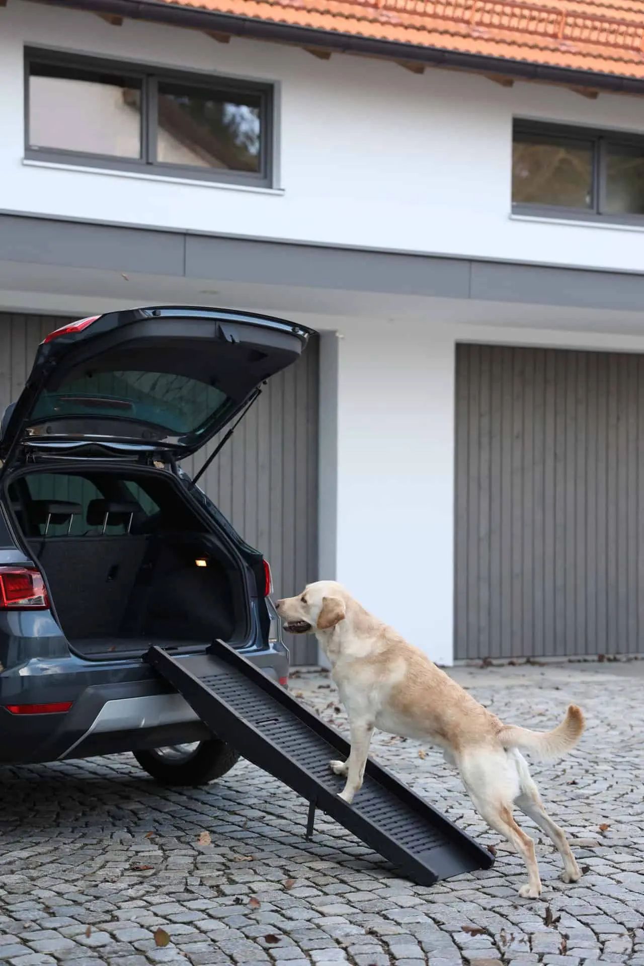Die Hunderampe ist eine tragbare Rampe, die besonders für Hunde bis 75 kg konzipiert wurde. Sie ist ideal für kleine oder ältere Hunde sowie für Hunde mit Bewegungseinschränkungen, die Unterstützung beim Zugang zu höheren Oberflächen benötigen.