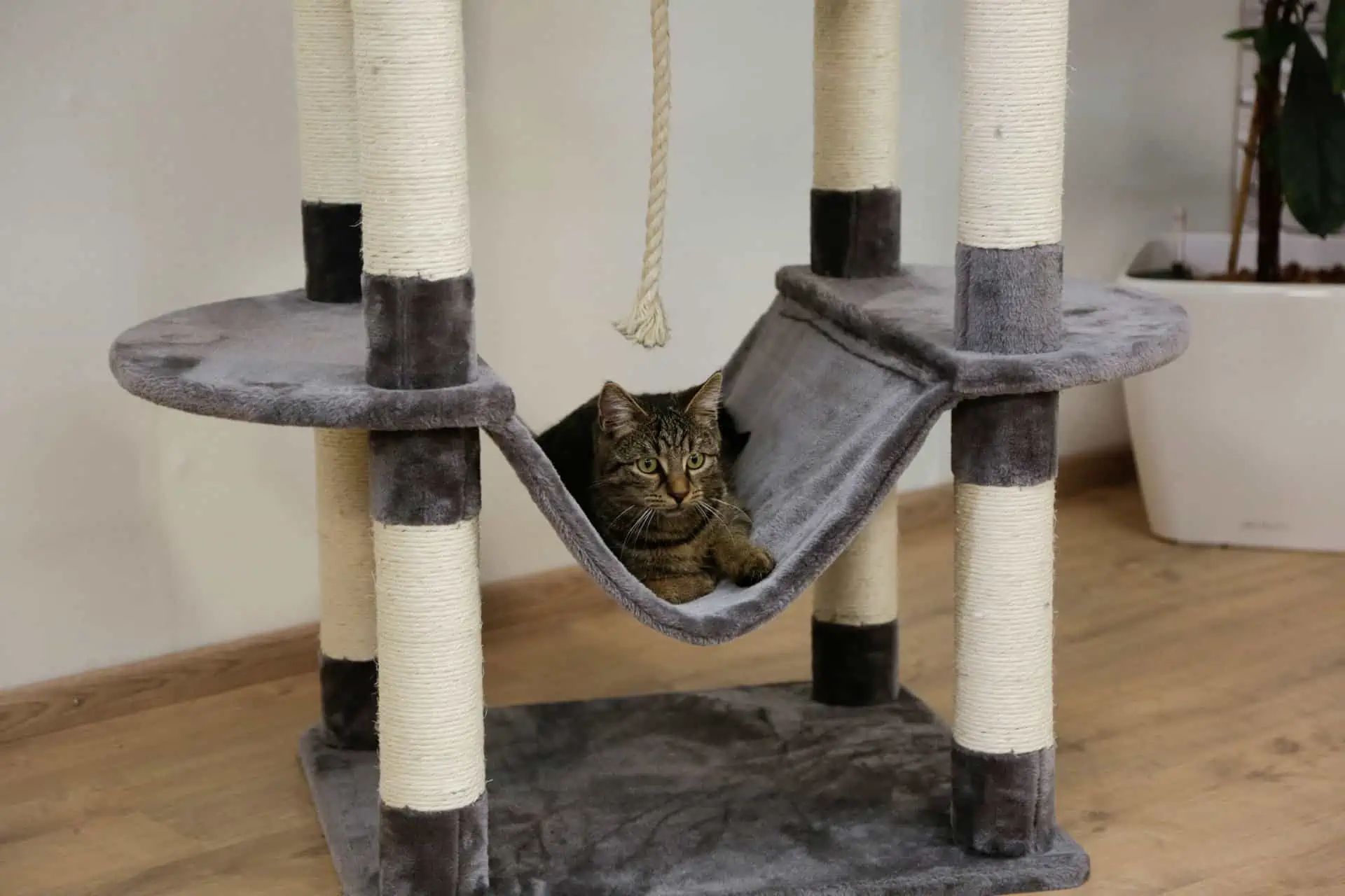 Der Kratzbaum Matteo grau bietet eine Vielzahl an Funktionen und Eigenschaften. Er verfügt über eine extra große Höhle, eine gemütliche Hängematte, ein Liegebett mit Umrandung und Sisalseil an den Säulen für die Krallenpflege. Seine moderne und standfeste Konstruktion sorgt für Langlebigkeit und Stabilität.