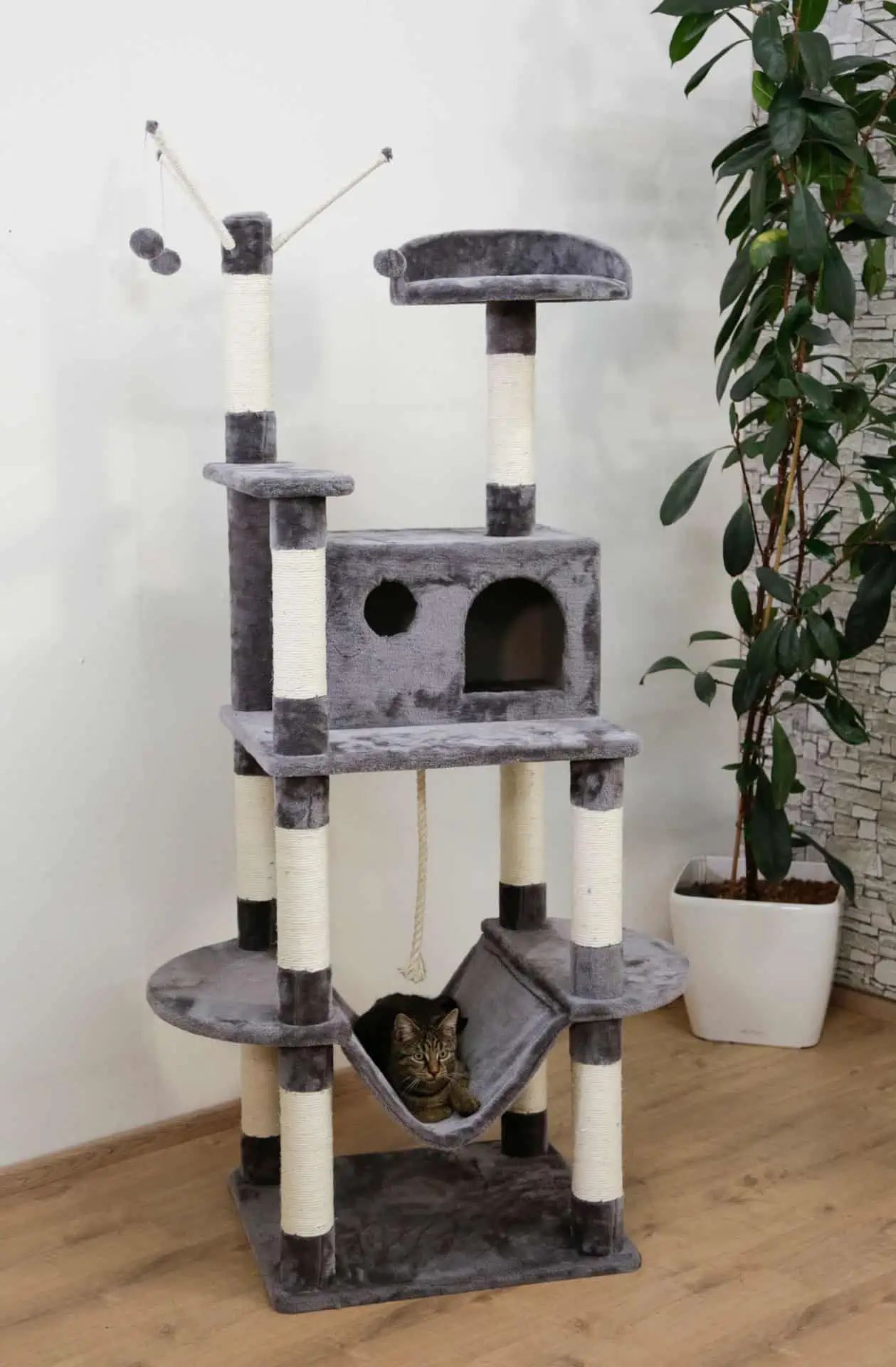 Der Kratzbaum Matteo grau bietet eine essentielle Funktion als Spielfläche und Ruheplatz für Ihre Katze. Er stellt sicher, dass Ihre Katze einen eigenen Bereich hat, um ihre natürlichen Instinkte zu befriedigen, indem sie kratzt, spielt, ruht und ihre Umgebung beobachtet.