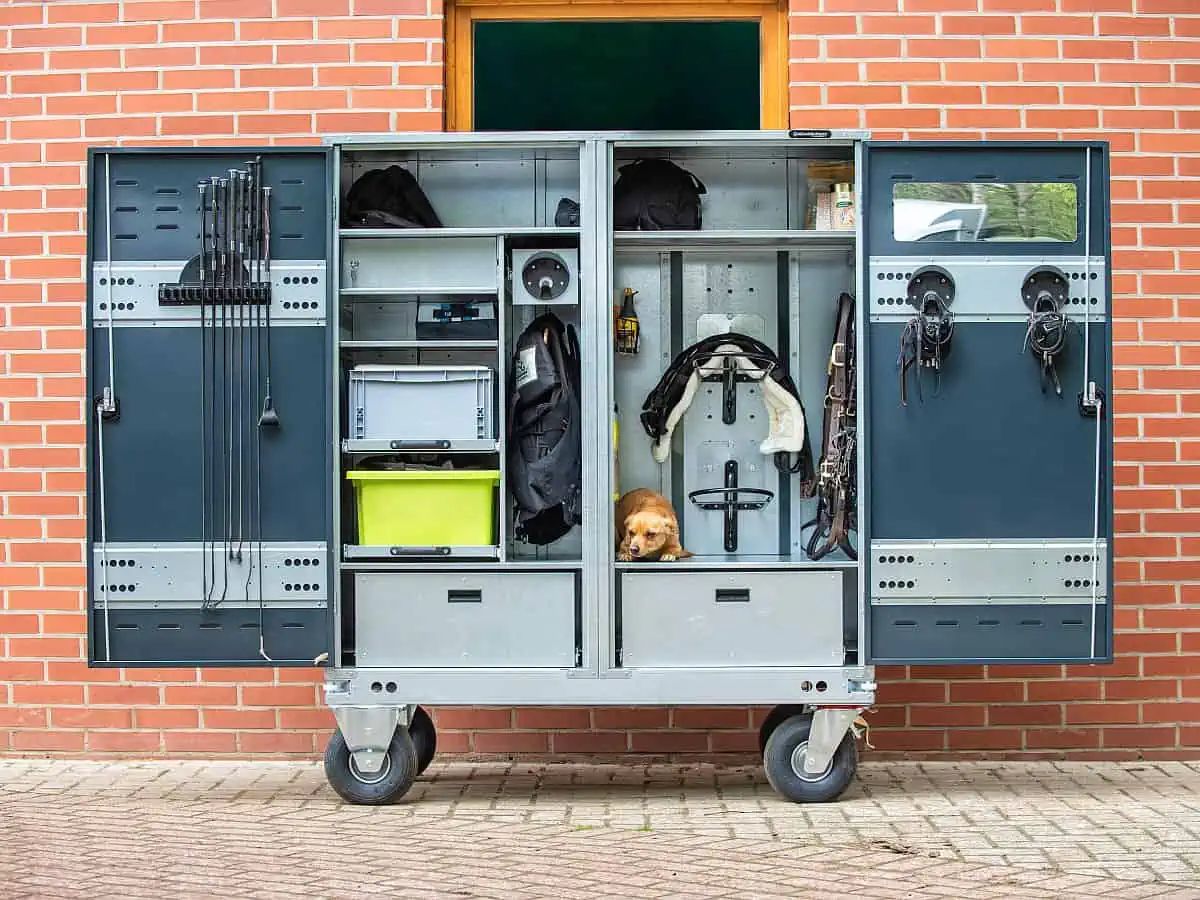 Der Growi Profi-Turnierschrank Pferd, verzinkt und pulverbeschichtet ist Ihr perfekter Partner für die Turniersaison. Seine umfangreiche Ausstattung und erstklassige Verarbeitung setzen Maßstäbe in Qualität und Design. Mit dieser mobilen und praktischen Aufbewahrungslösung haben Sie Ihr Turnierzubehör immer griffbereit. Vergessen Sie das langwierige Suchen nach Sattel, Trensen und Kleidungsstücken, denn mit diesem gut organisierten Schranksystem starten Sie entspannt und strukturiert in Ihr Turnier.