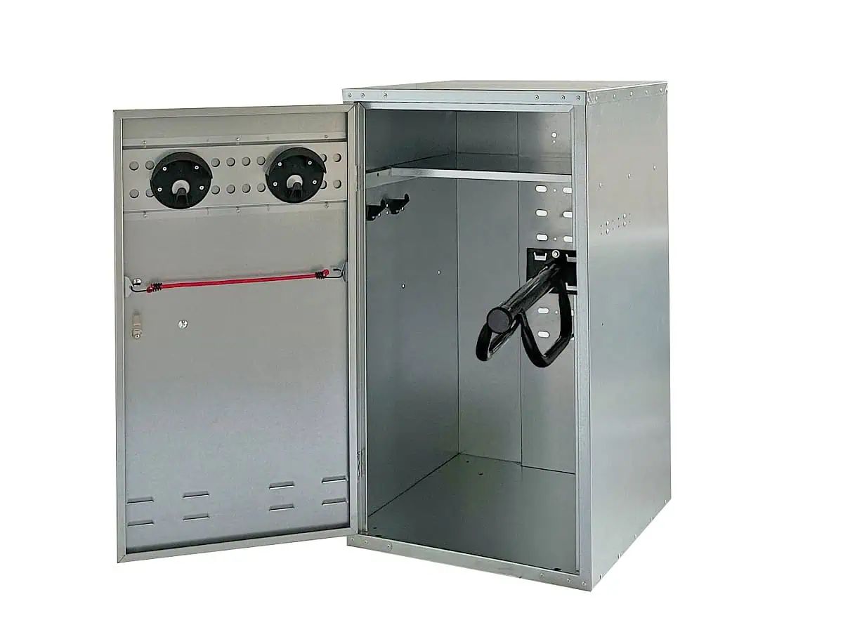 Der Growi Sattelschrank Standard eignet sich besonders für Reiter, die sowohl Sicherheit als auch eine flexible Innenaufteilung schätzen. Dank der genieteten Bauweise entfällt die Notwendigkeit für Farbausbesserungen an den Schweißpunkten, und durch die Verwendung von Blindnieten wird Korrosion vorgebeugt. Der Schrank kann entweder mit einem Zylinderschloss oder wahlweise für ein Vorhangschloss ausgestattet werden, um Ihre Ausrüstung optimal zu sichern.
