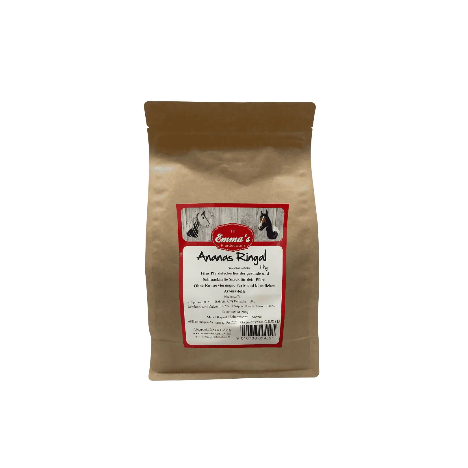 Ermögliche deinem Pferd ein gesundes und schmackhaftes Leckerli-Erlebnis mit Emmas Pferdeleckerli Ananas Ringal. Diese natürlichen Leckerlis sind nicht nur ein Genuss, sondern fördern auch das Wohlbefinden deines Pferdes. 100 % Natur, ohne künstliche Farb- und Konservierungsstoffe sowie ohne Geschmacksverstärker, bieten sie eine gesunde Alternative zu herkömmlichen Leckerlis. Hergestellt in einer kleinen Mühle in Deutschland, überzeugen die Ananas Ringal durch ihre sehr geschmacksintensive Rezeptur und eine extrem hohe Akzeptanz bei Pferden.