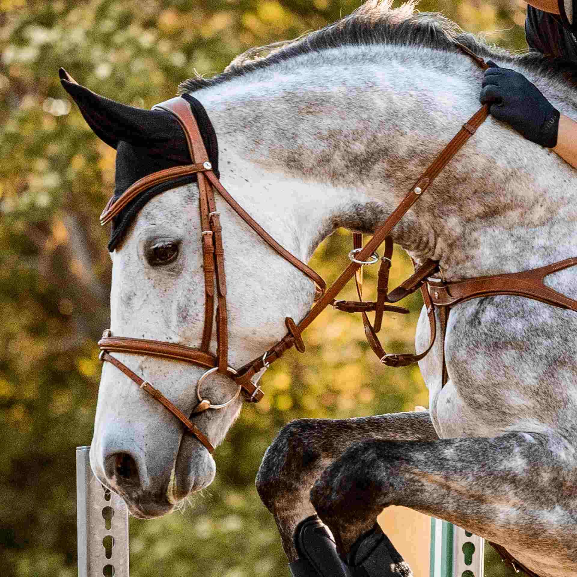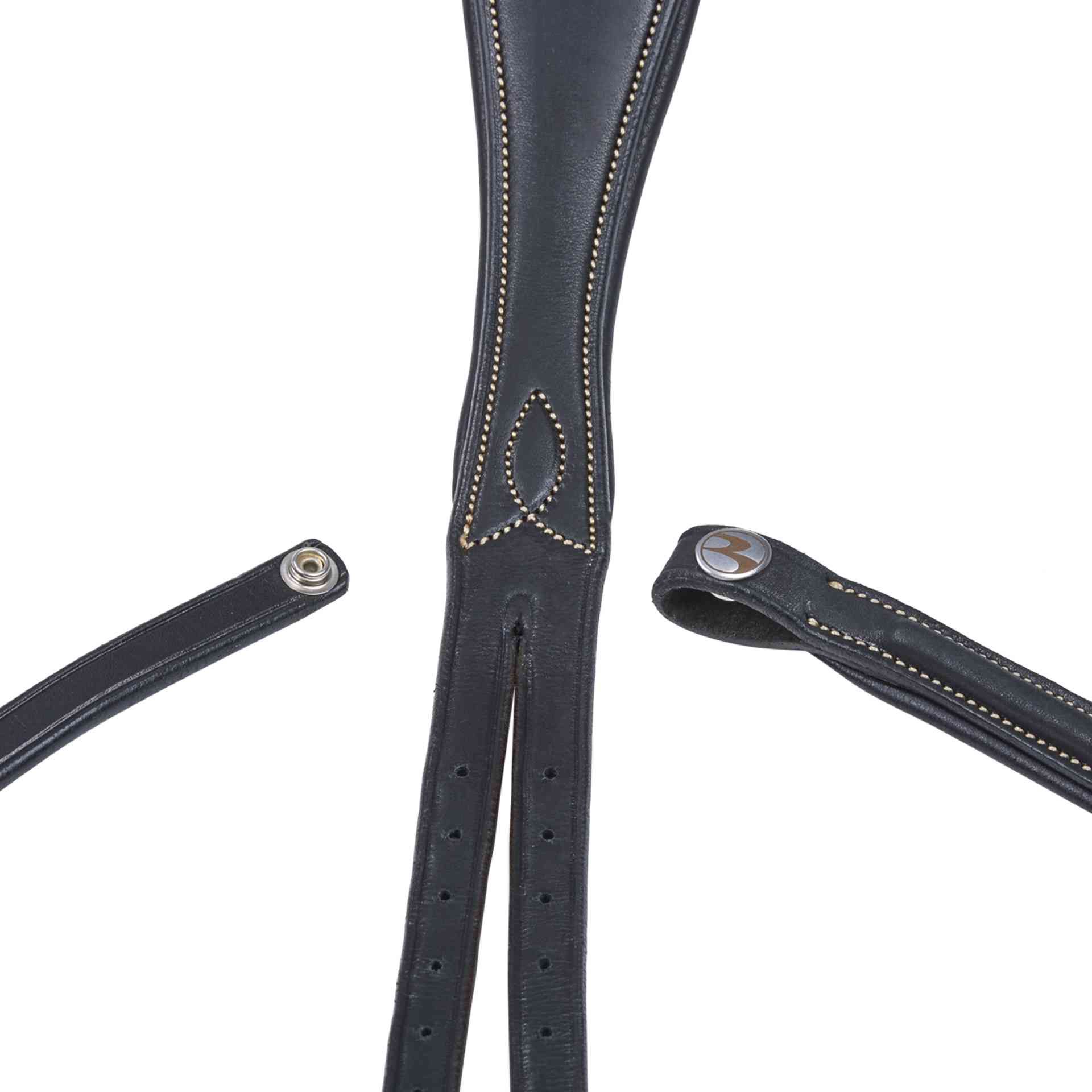- Griffige Gurtzügel mit Martingalschiebern, Lederstegen, Lederenden, Edelstahlschnallen und abgestimmten Ziernähten