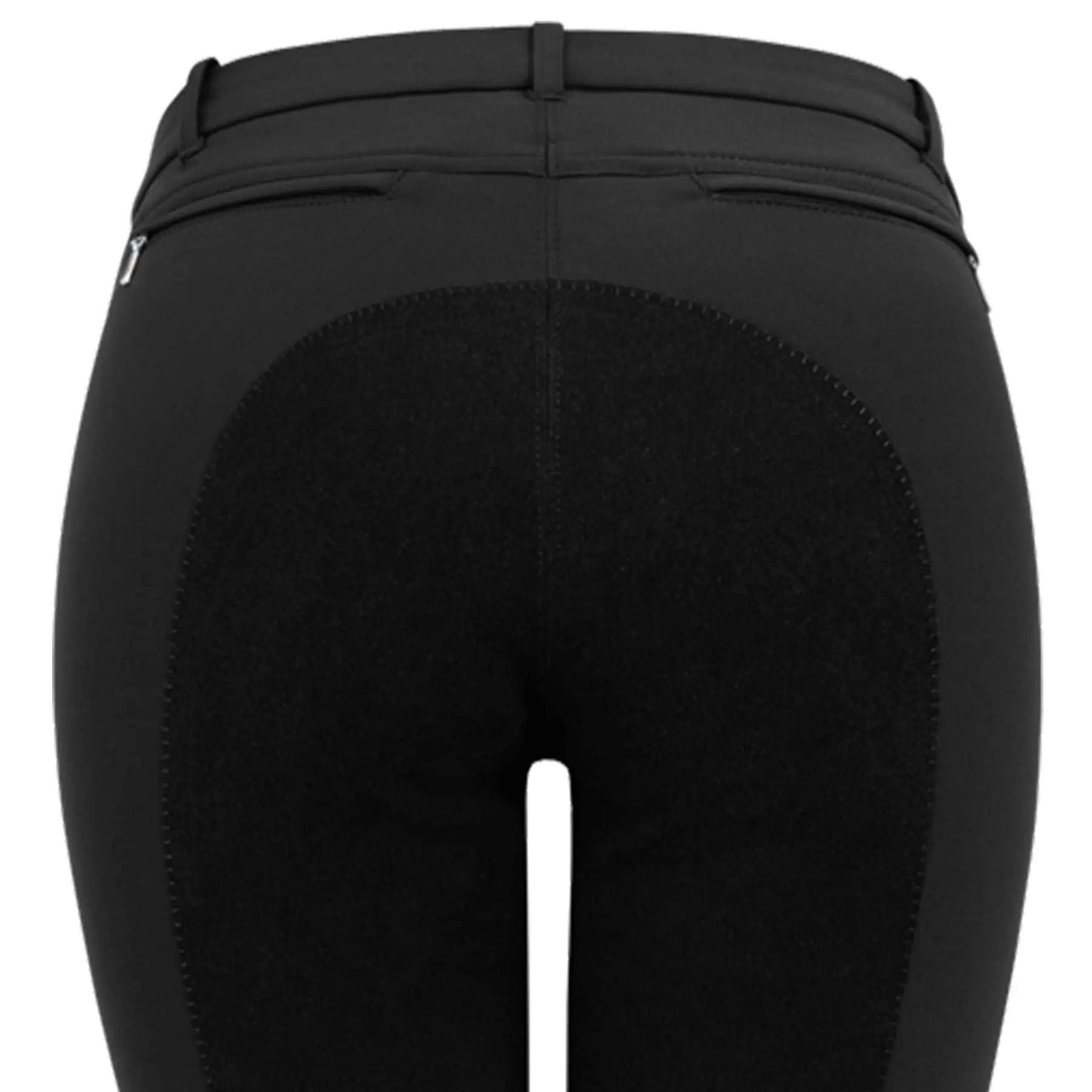 Der ausgestellte Beinabschluss mit Gummisteg garantiert einen sicheren Sitz und verhindert lästiges Verrutschen. Praktische Reißverschlusstaschen an der Vorderseite bieten Platz für kleine Essentials. Das zeitlose Design macht die Reithose zu einem vielseitigen Begleiter für jeden Reiterausflug.