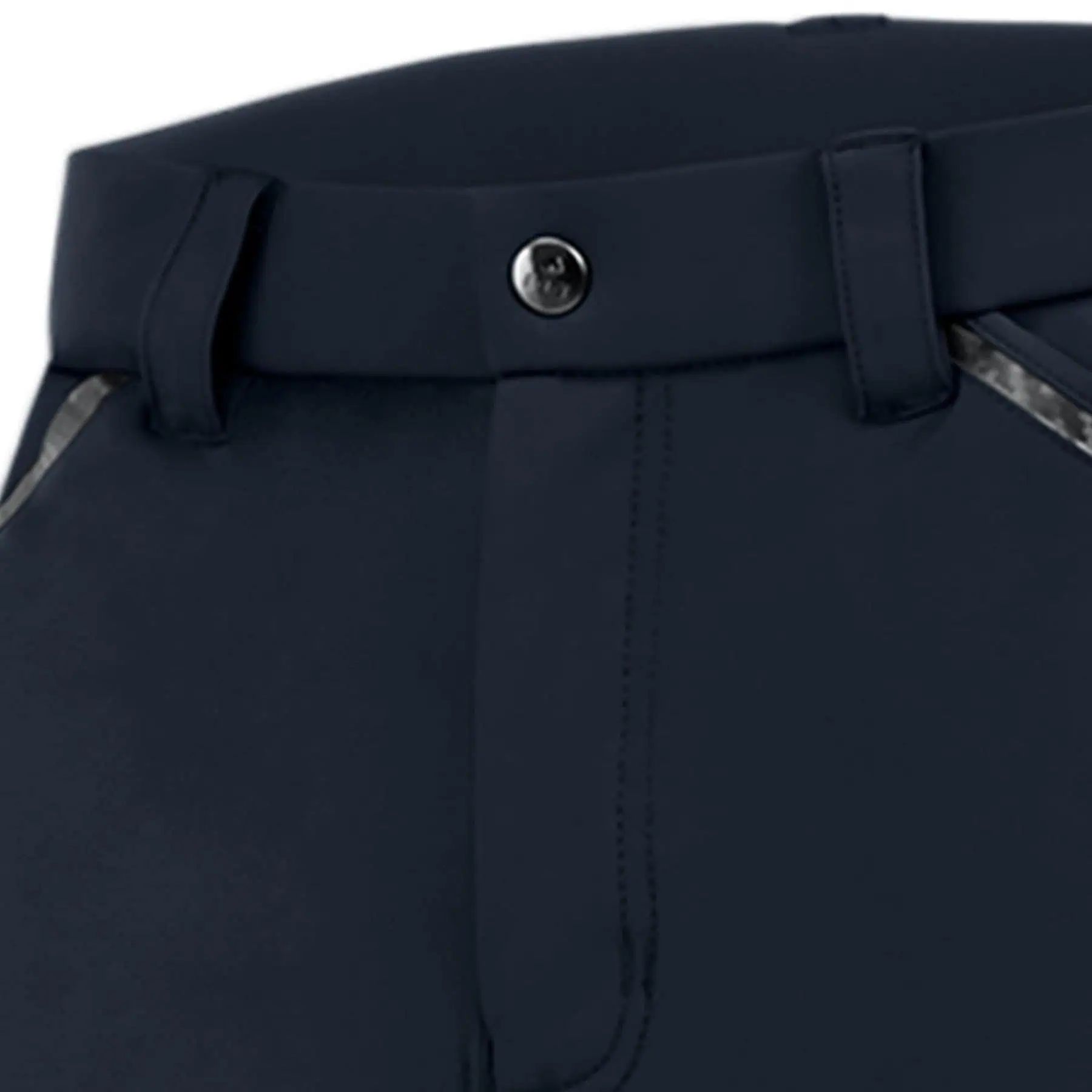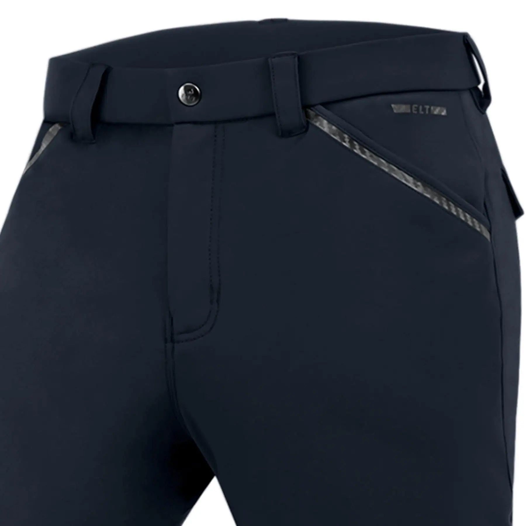 Die Reithose verfügt über Eingrifftaschen mit Carbon-Tape auf der Vorderseite und aufgesetzte Patten-Taschen mit Knopf auf der Rückseite.