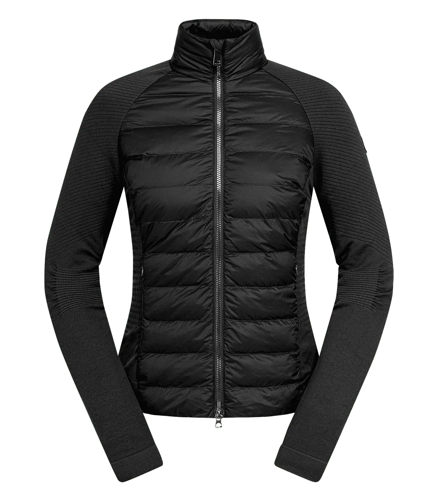 Die Jacke besteht aus einem Materialmix: Vorder- und Rückenteil sind gesteppt, Seitenteile und Ärmel aus 3D-Strickware mit unterschiedlichen Strickzonen.