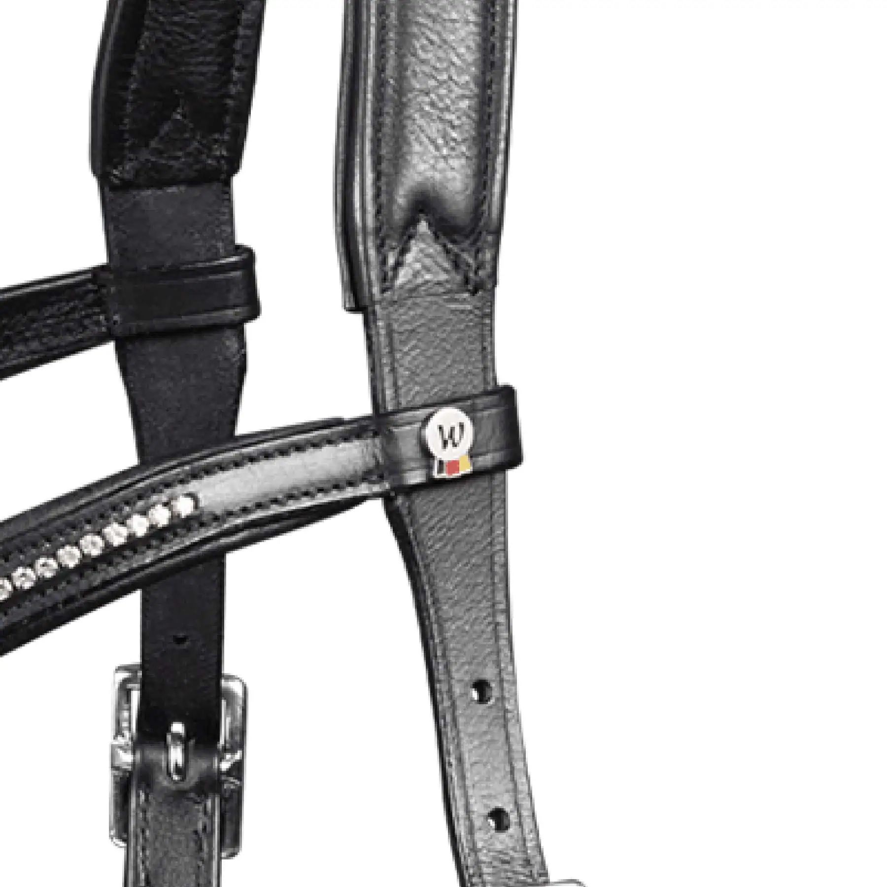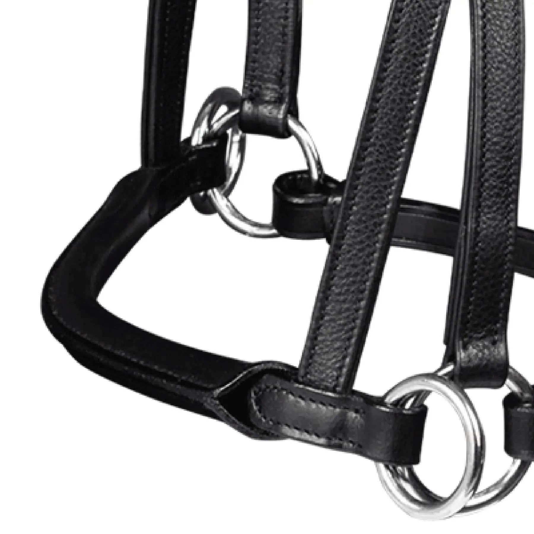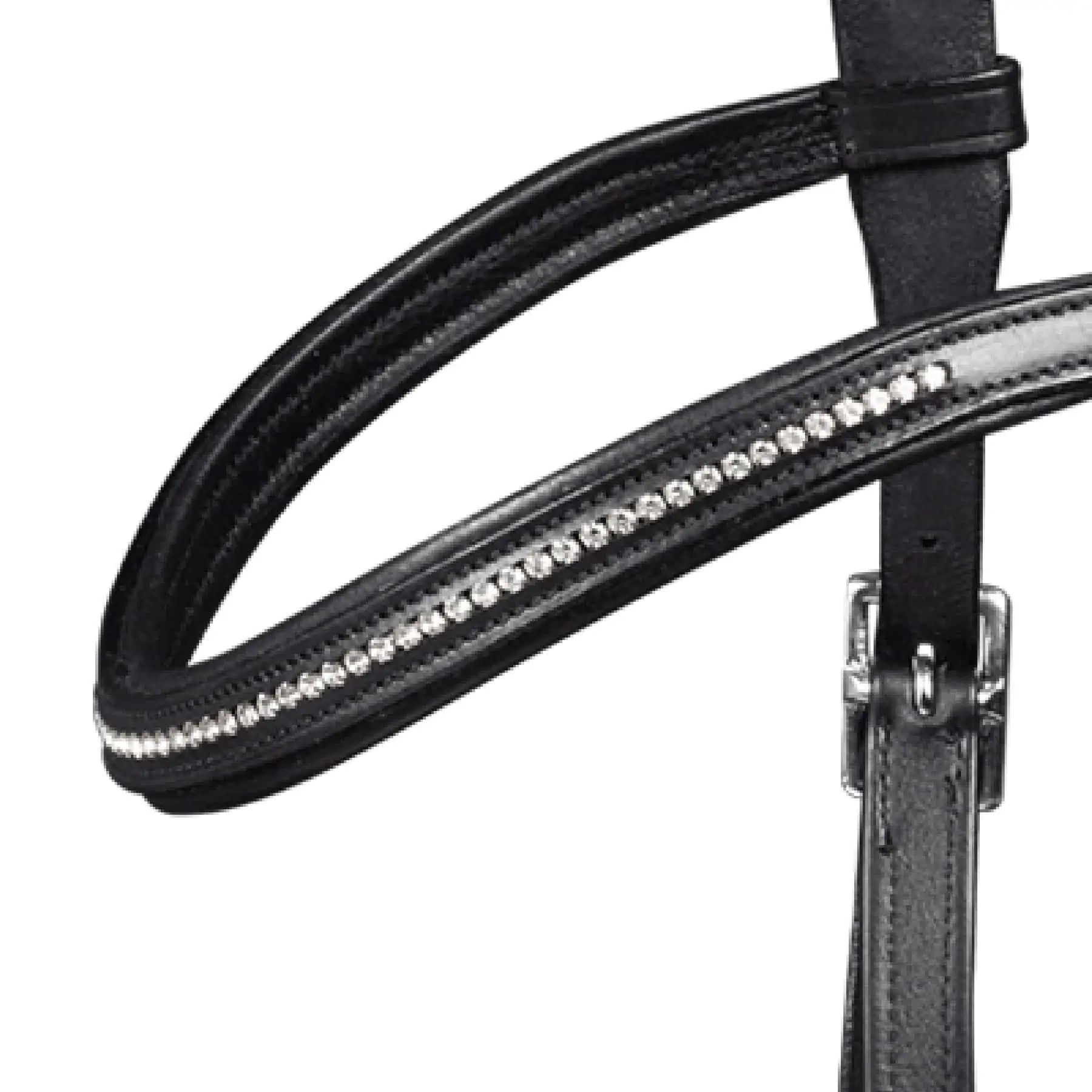 Das anatomisch geformte Genickstück sorgt für optimalen Tragekomfort und schont die empfindlichen Bereiche des Pferdes. Das Design ist nicht nur funktional, sondern auch elegant: Das geschwungene Stirnband mit Strasskette setzt wunderschöne Akzente.